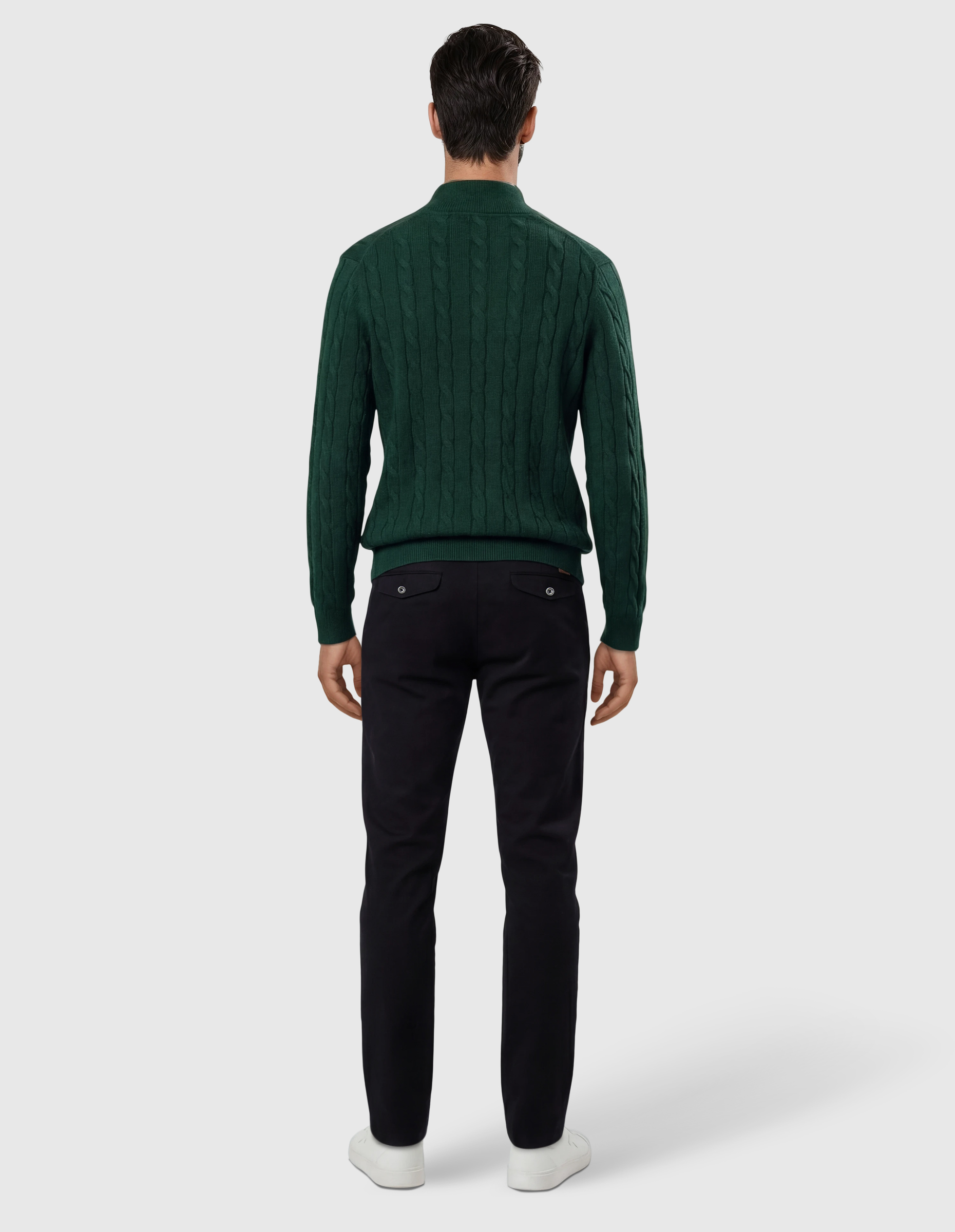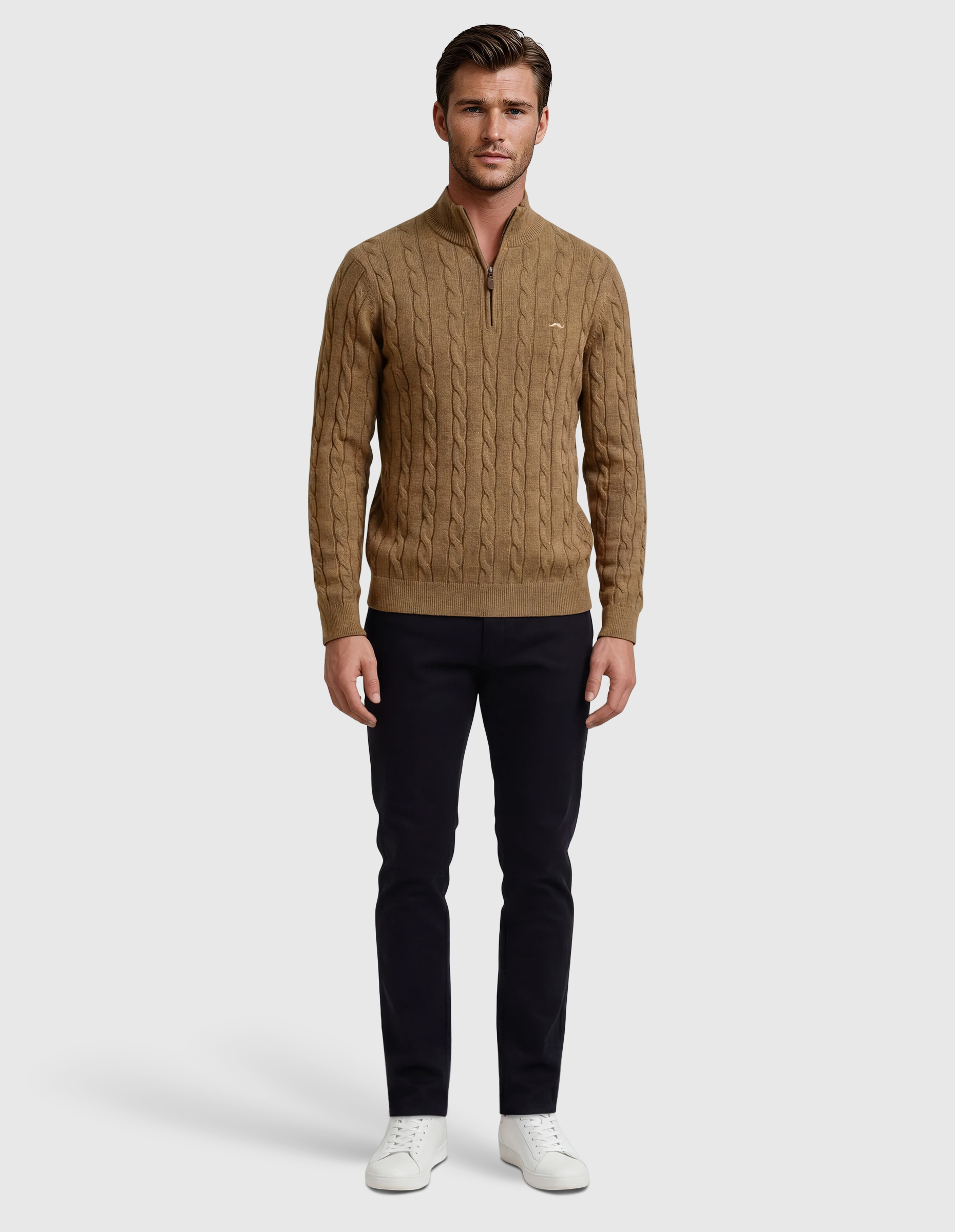 Jersey corte recto cuello perkins media cremallera. Tejido de punto trenzado. Acabados acanalados. Bigote bordado a tono. Acabado BCI.