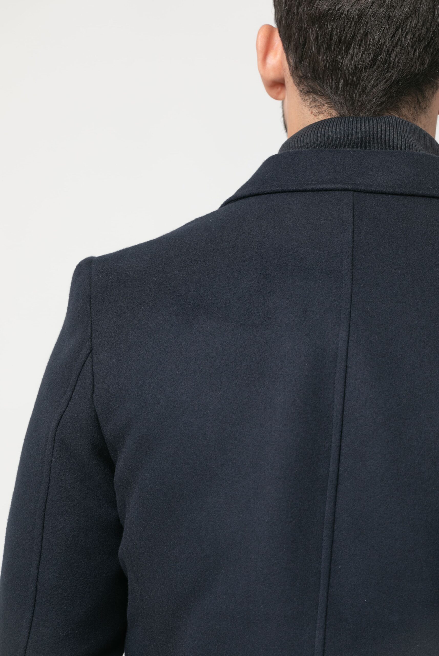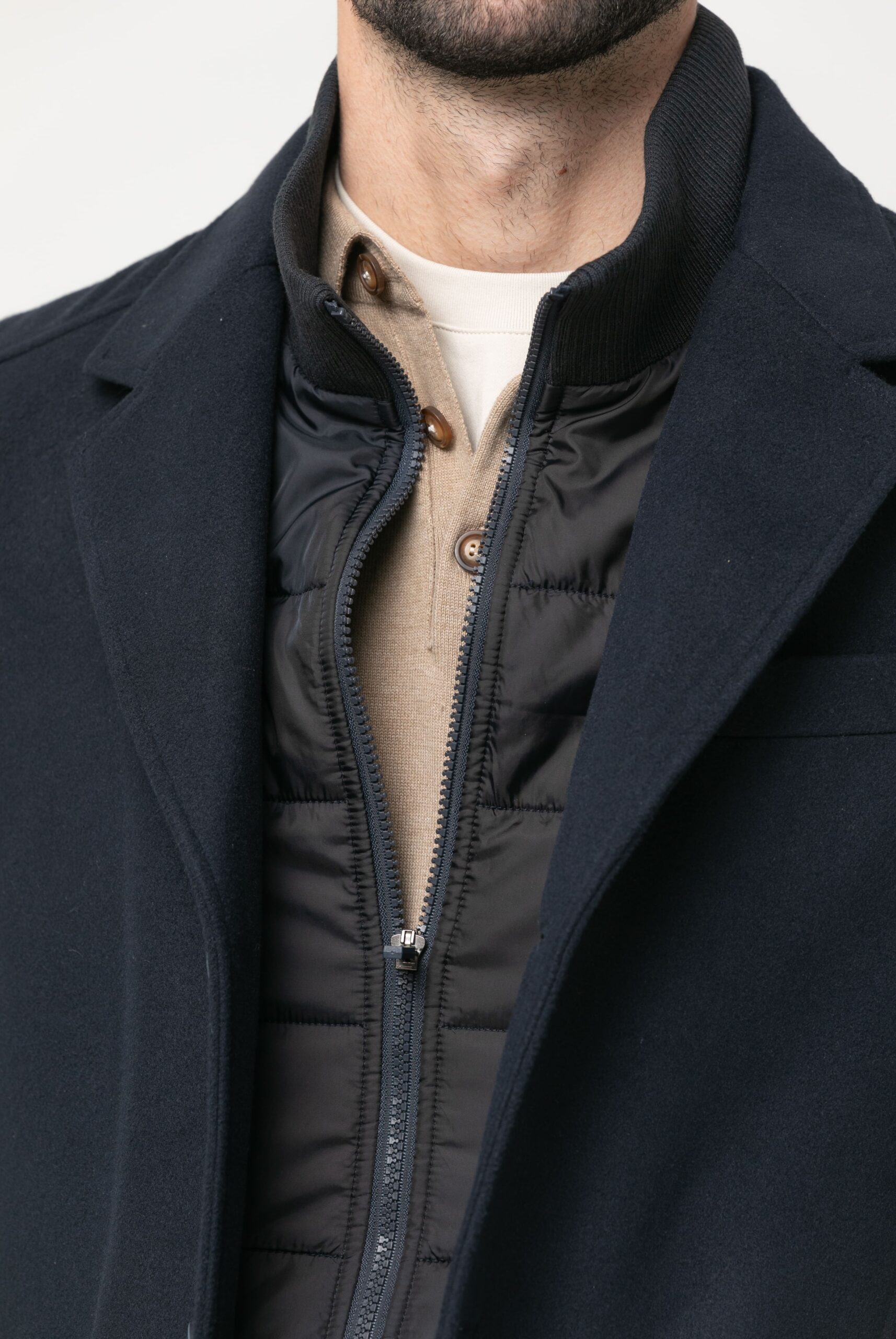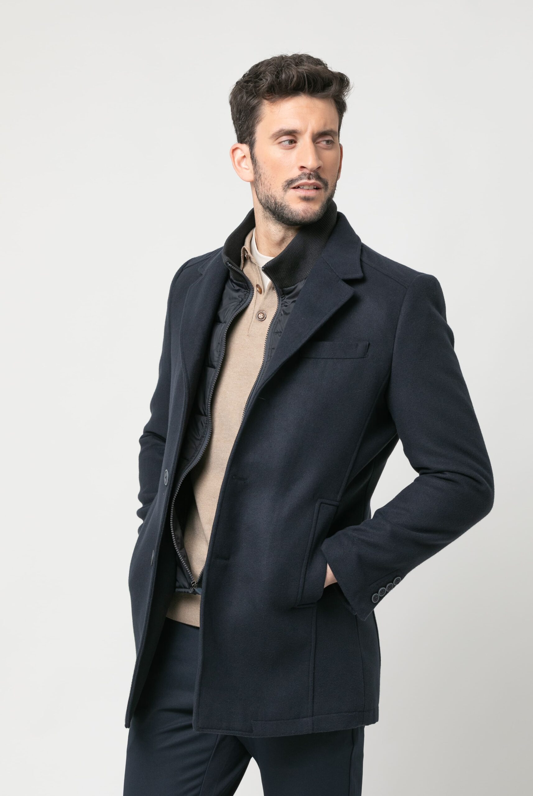 Abrigo de cuello solapa con pecherín desmontable de nylon que cierra con cremallera. Manga larga acabada con detalle de botones. Bolsillos frontales de vivo y detalle de bolsillos interiores en forro. Bajo con abertura central en espalda. Cierre en delantero con botones.