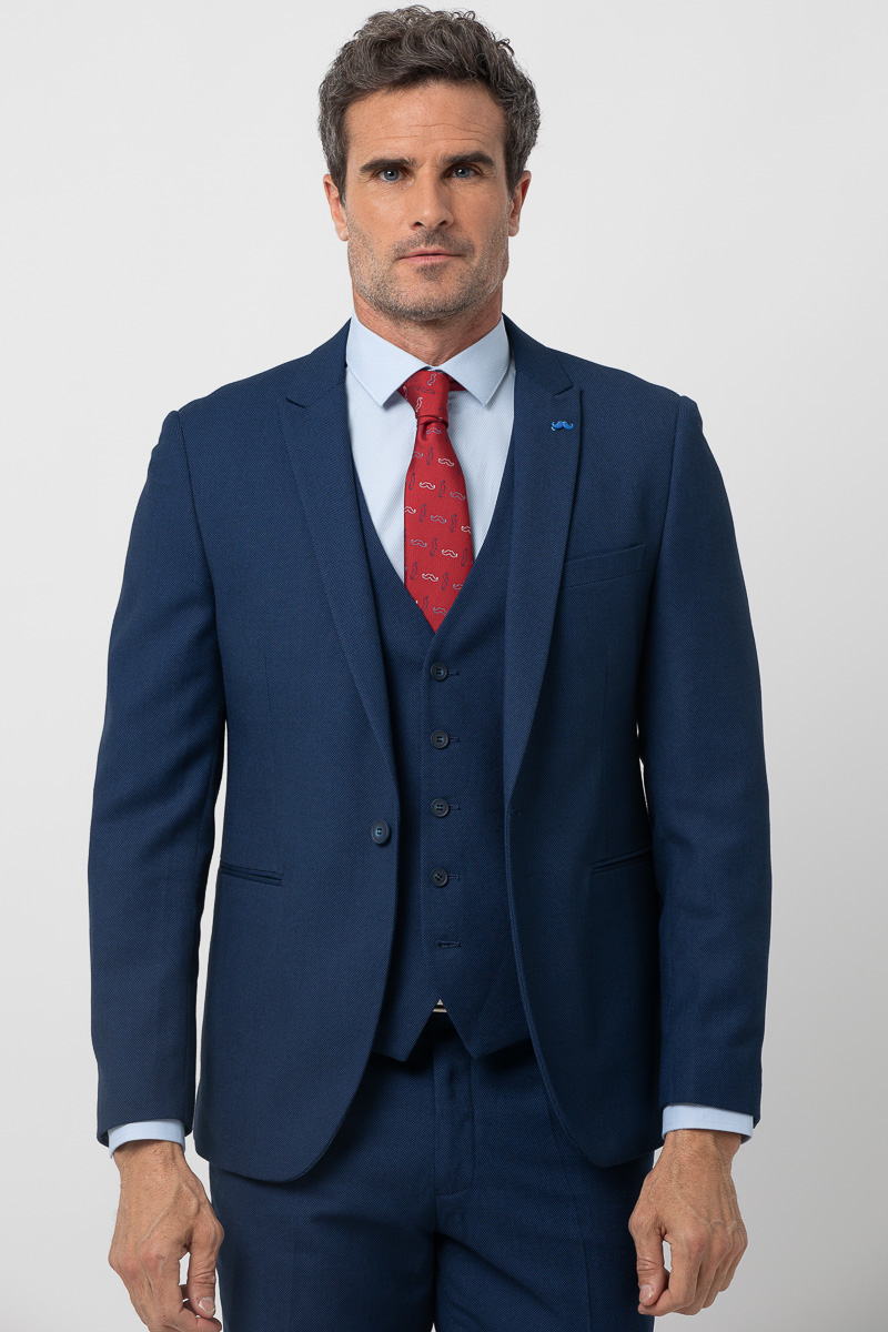 Americana confeccionada en tejido falso liso. Corte regular fit sin que sea muy entallado pero ensalzando la figura masculina, con bolsillos de vivo y bolsillo a la altura del pecho. Solapa de pico, ojal y pin de la marca en contraste. Cierre con dos botones. Manga larga rematada con cuatro botones. Dos aberturas en la parte posterior, forro y varios bolsillos interiores. Combínala con el pantalón España Ref 2510113001 y el chaleco España Ref. 2619924002 para completar el traje de tres piezas.