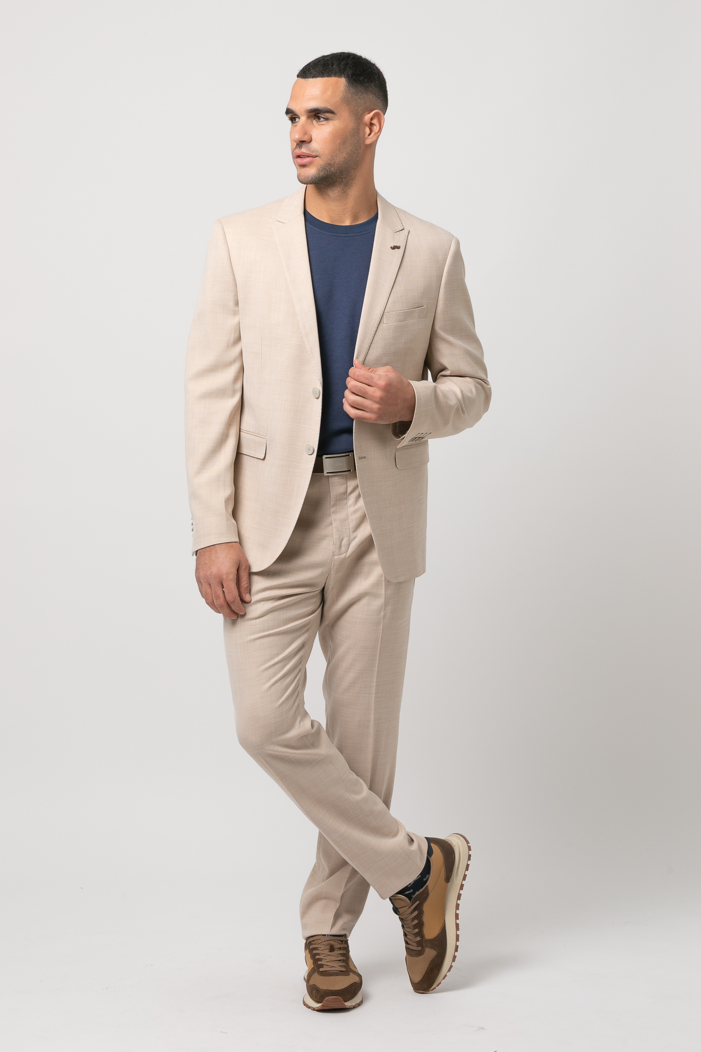Elegancia ligera para los meses cálidos. Este conjunto combina la formalidad del traje con la frescura de una paleta clara y líneas depuradas, ideal para eventos, trabajo u ocasiones especiales de temporada.