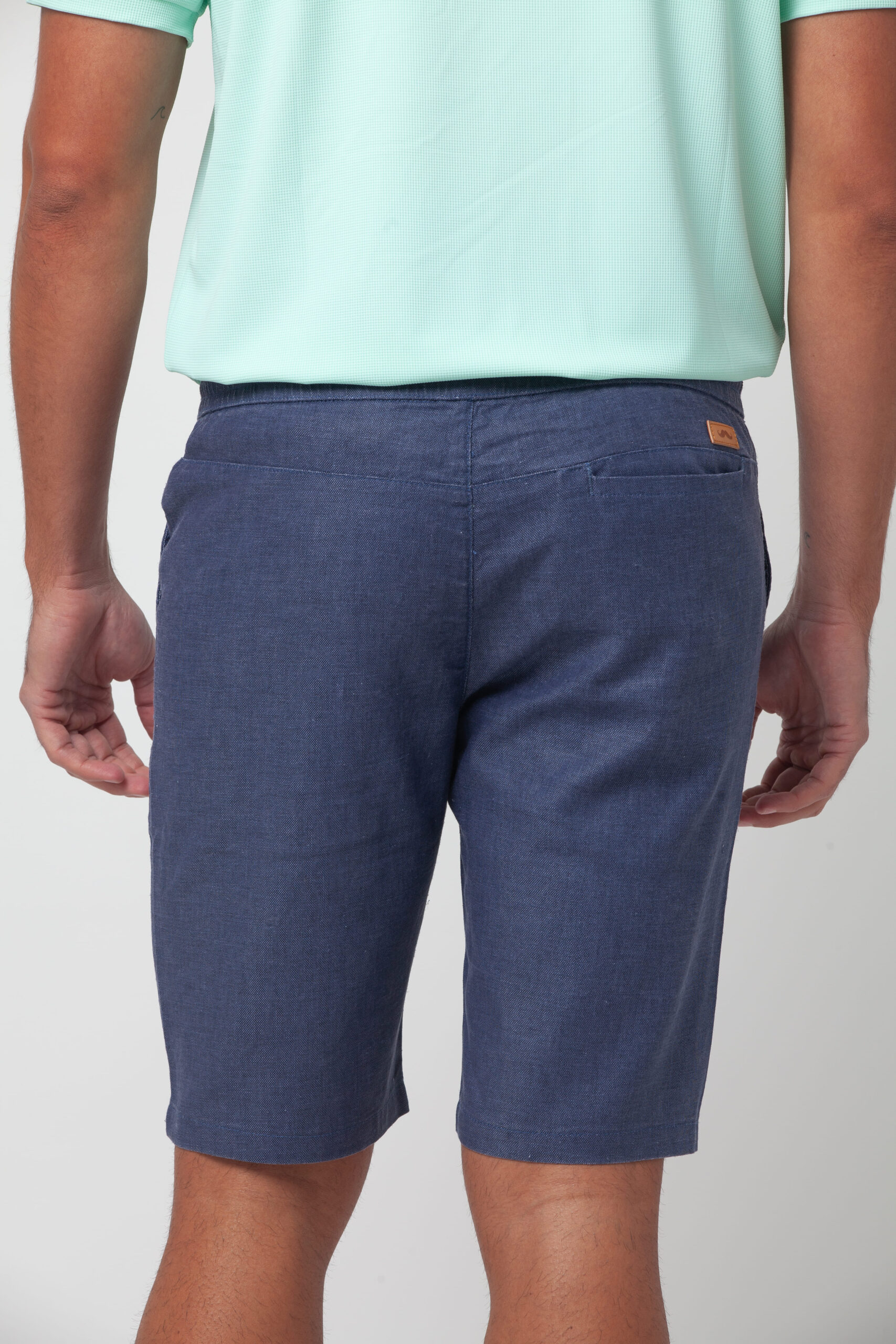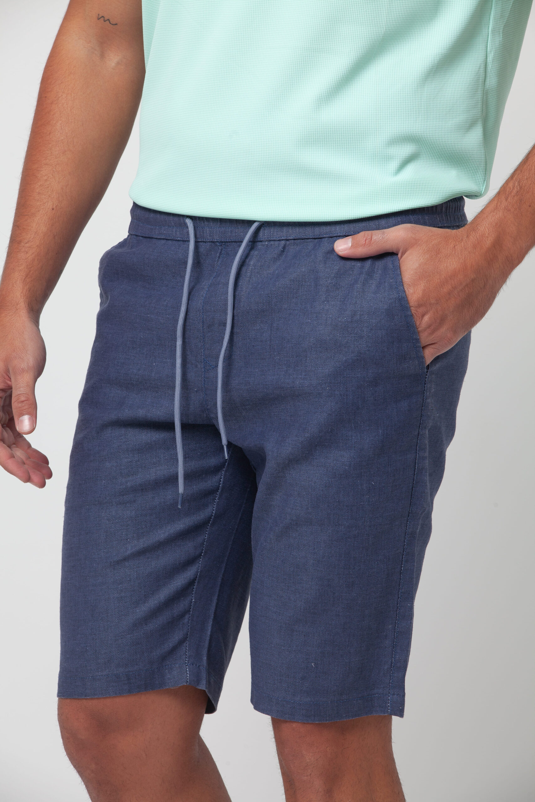Pantalón corto efecto lino confeccionado en tejido algodón y lino. Corte Slim, cinturilla de goma con cordón, dos bolsillos laterales y dos rasgados en la parte posterior