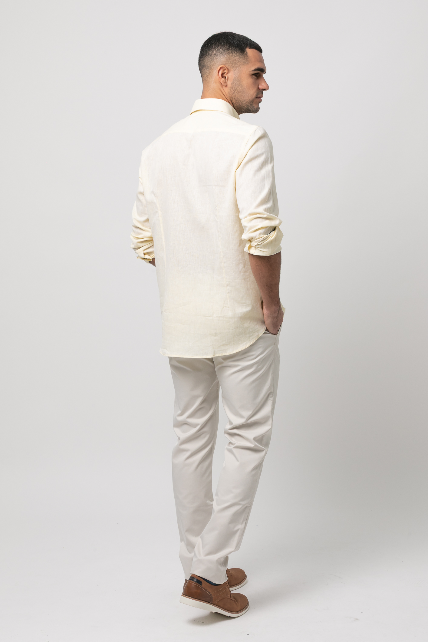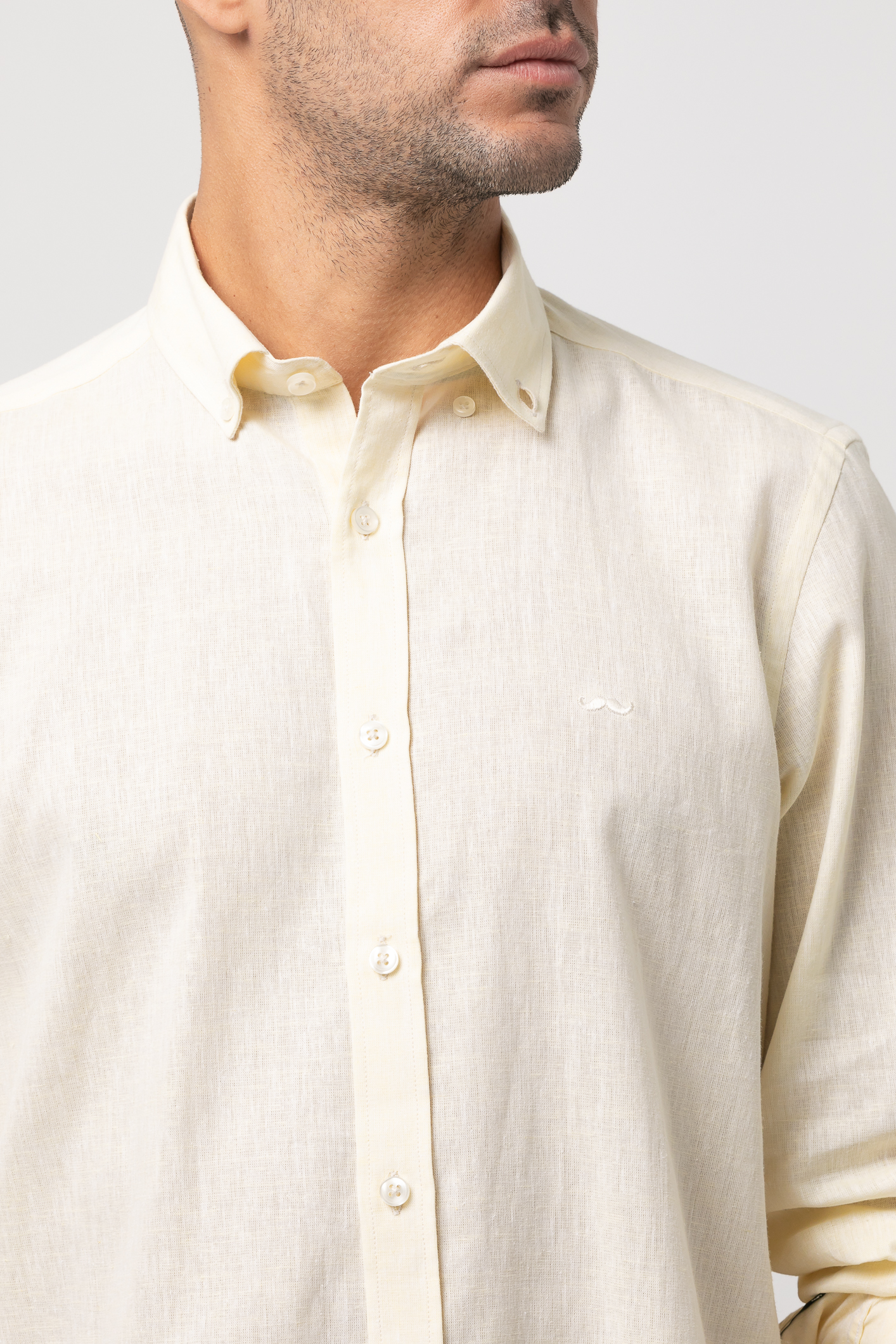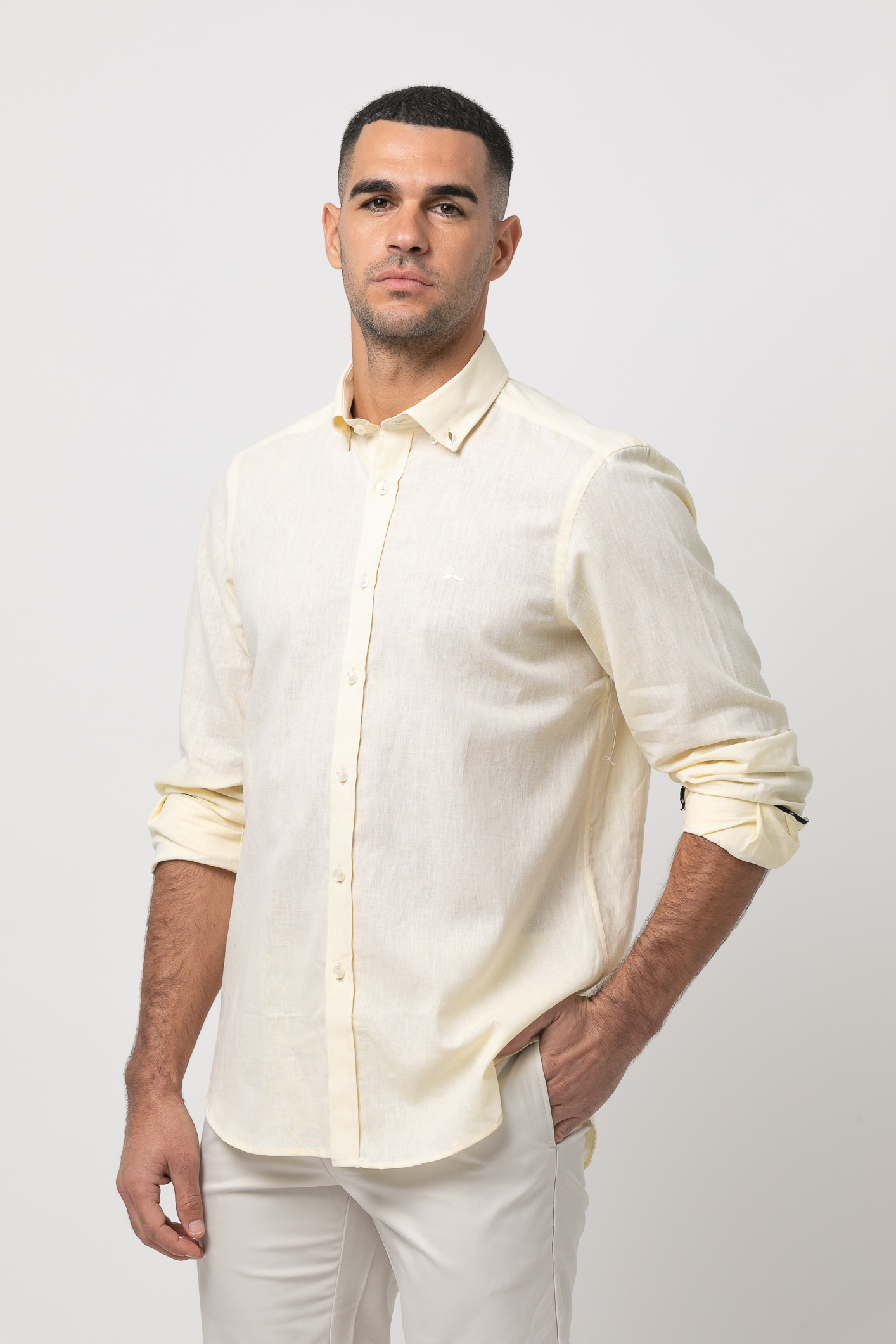Camisa sport vestir de lino, Silueta Slim que ensalza la figura masculina, cuello botón. Cierre delantero con botones. Manga larga con puños con doble botón. Pinza en la parte posterior. Logo de la marca en el pecho al tono