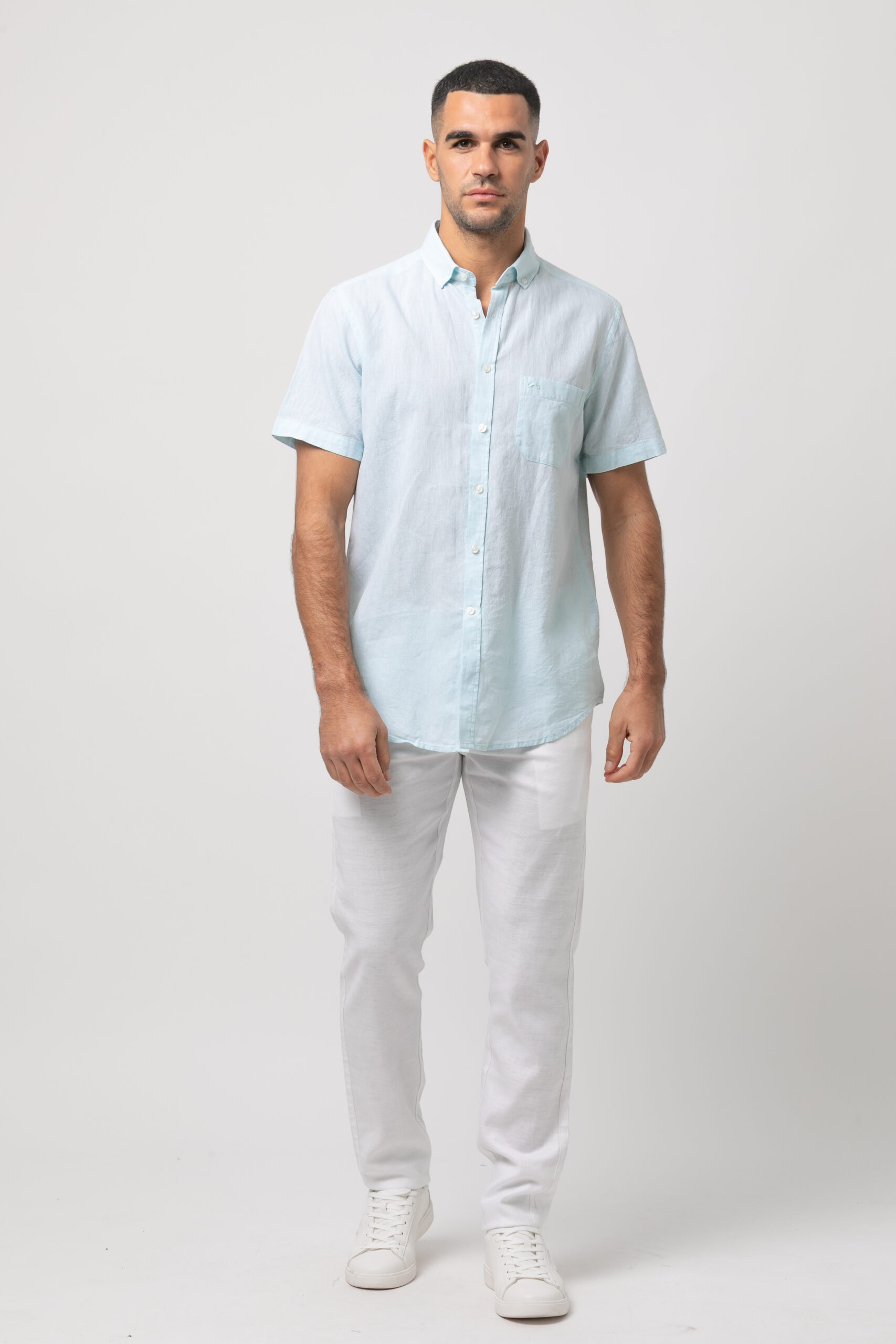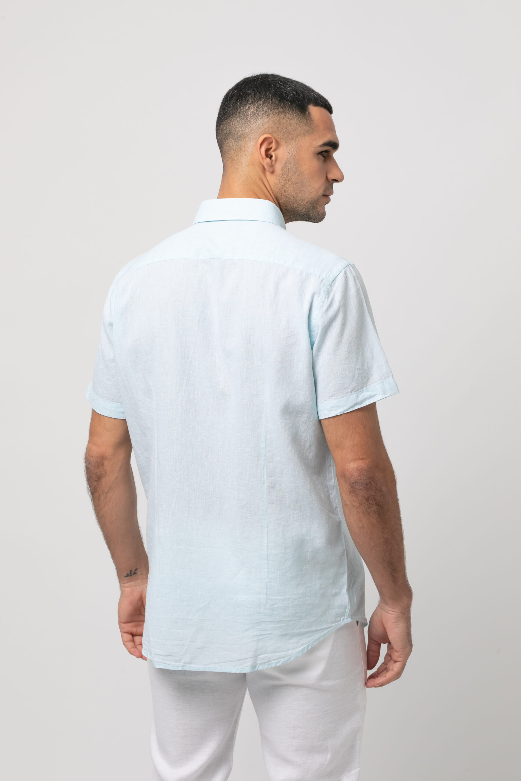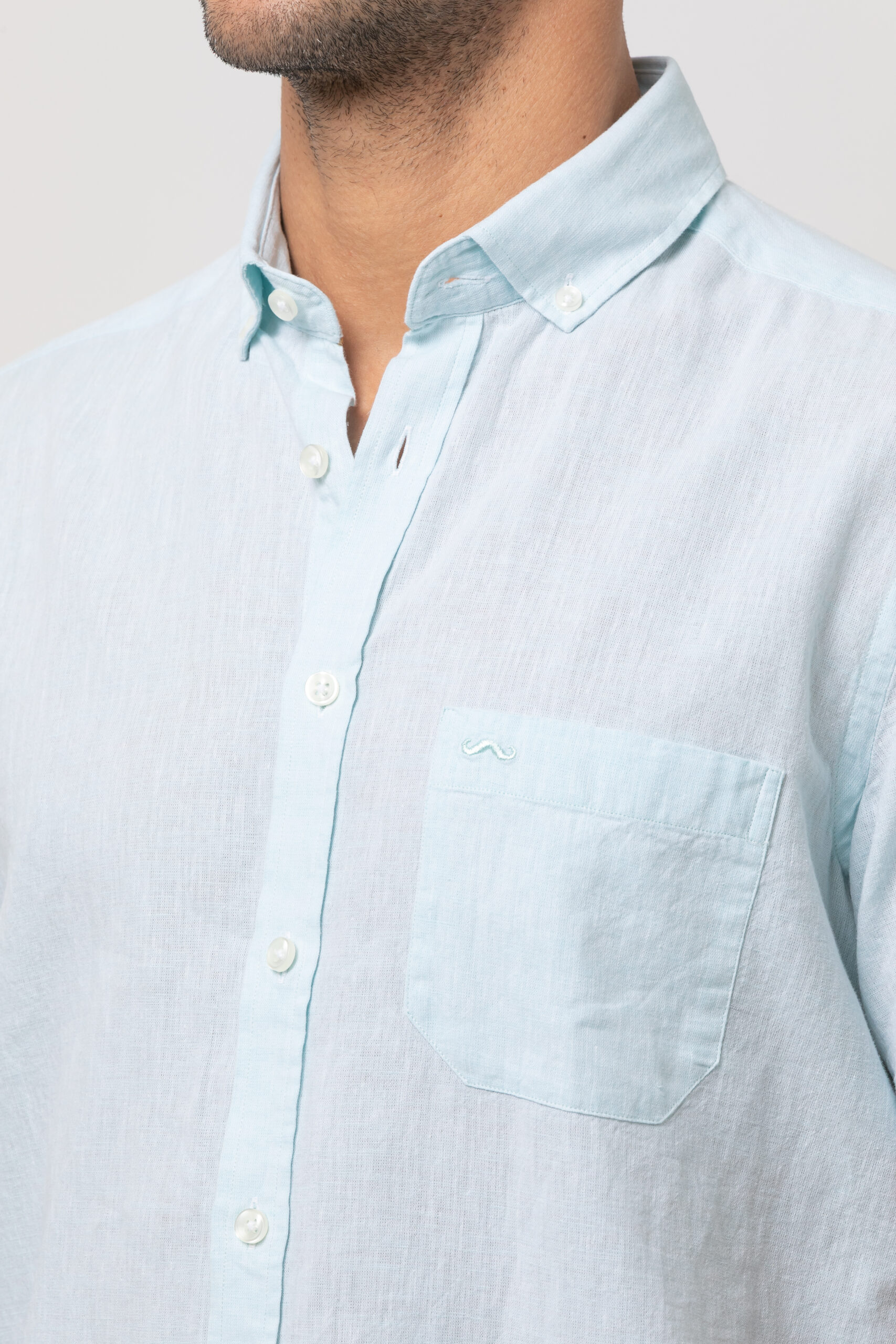 Camisa sport vestir de lino. Silueta Slim que ensalza la figura masculina. Cuello botón. Manga larga, Cierre con tapeta en el delantero con botones. Pinza en la parte posterior. Logo de la marca en el bolsillo