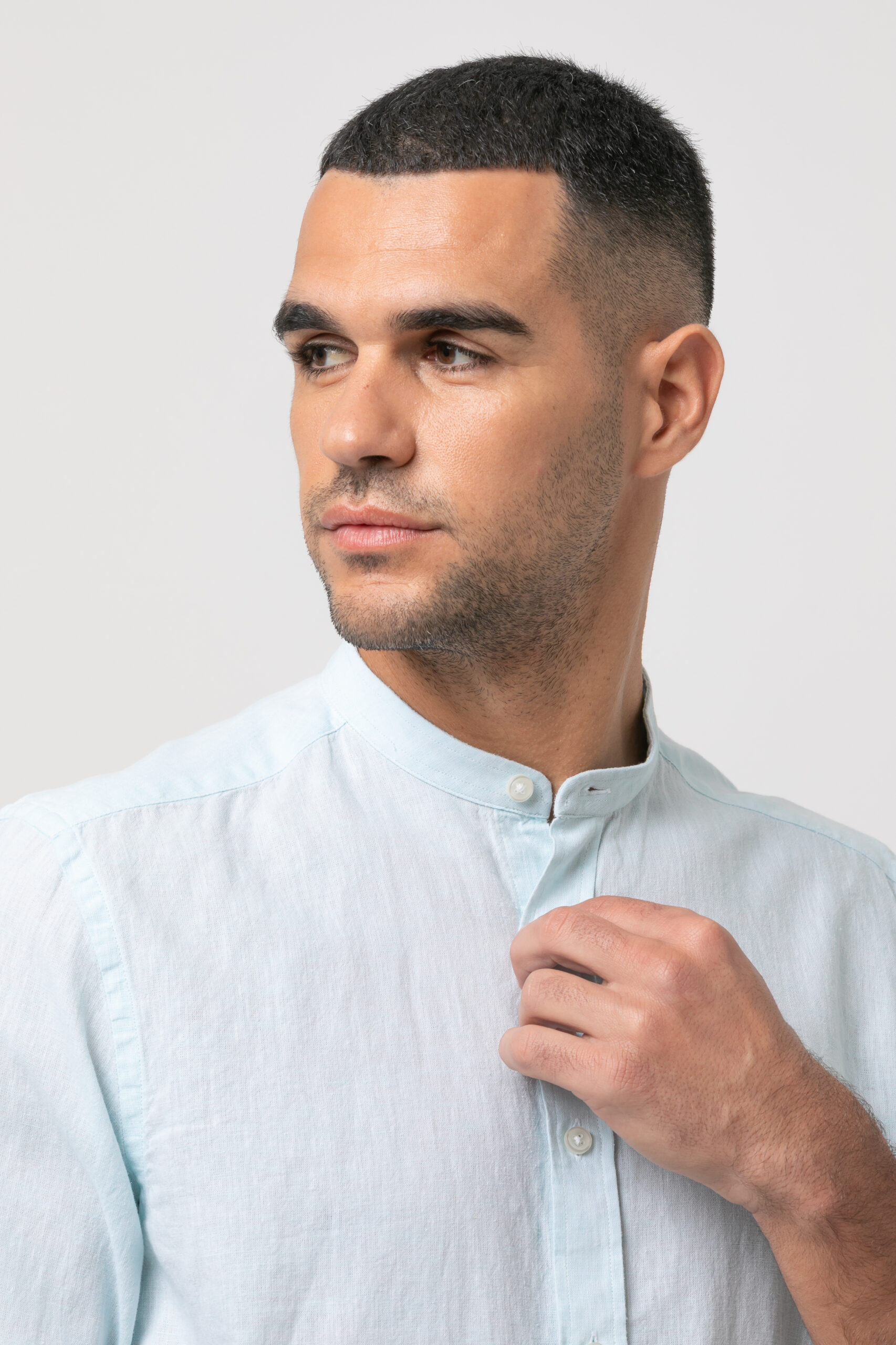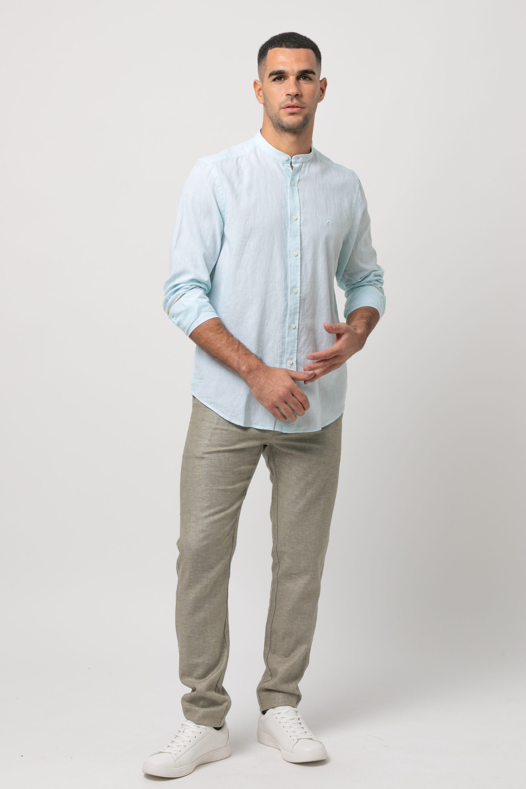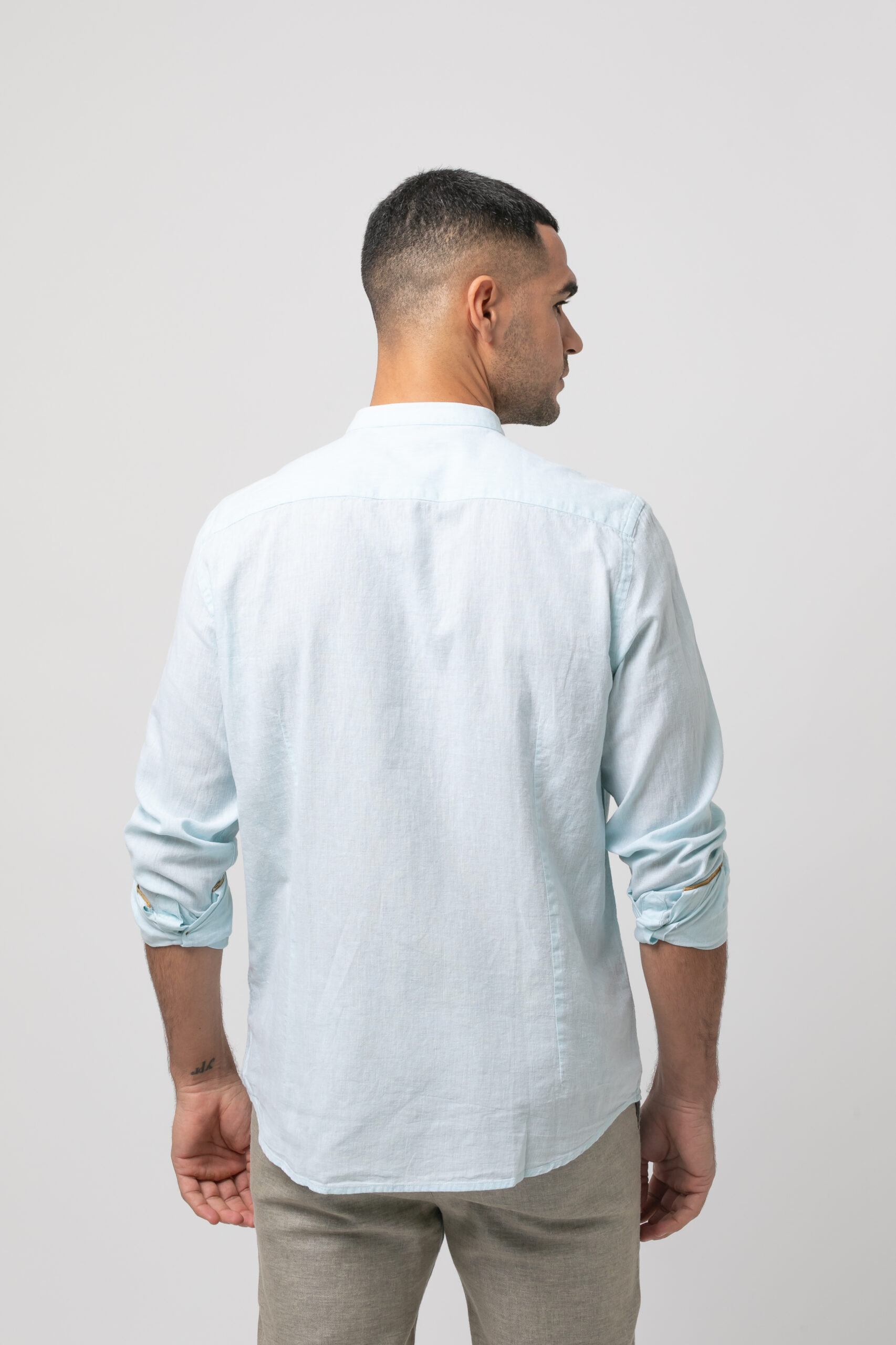 Camisa sport vestir de lino. Silueta Slim que ensalza la figura masculina. Cuello Mao. Manga larga Cierre con tapeta en el delantero con botones. Pinza en la parte posterior. Logo de la marca en el bolsillo.