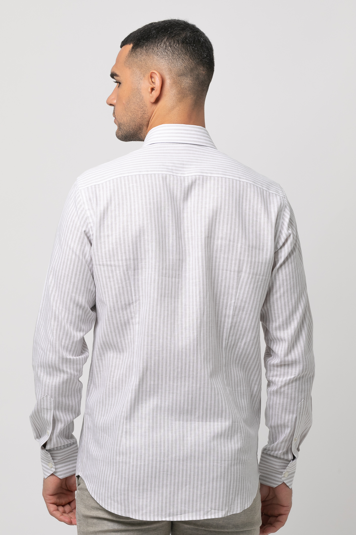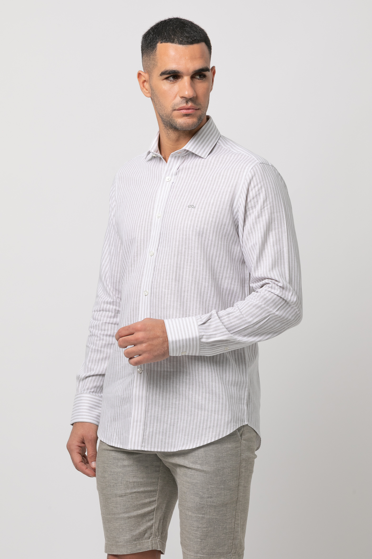 Camisa de micro rayas. Corte Slim que ensalza la silueta masculina cuello mao, cierre mediante botonadura frontal en tapeta y manga larga terminada en puño abotonado redondeado. Bordado de la marca en interior de tapeta.