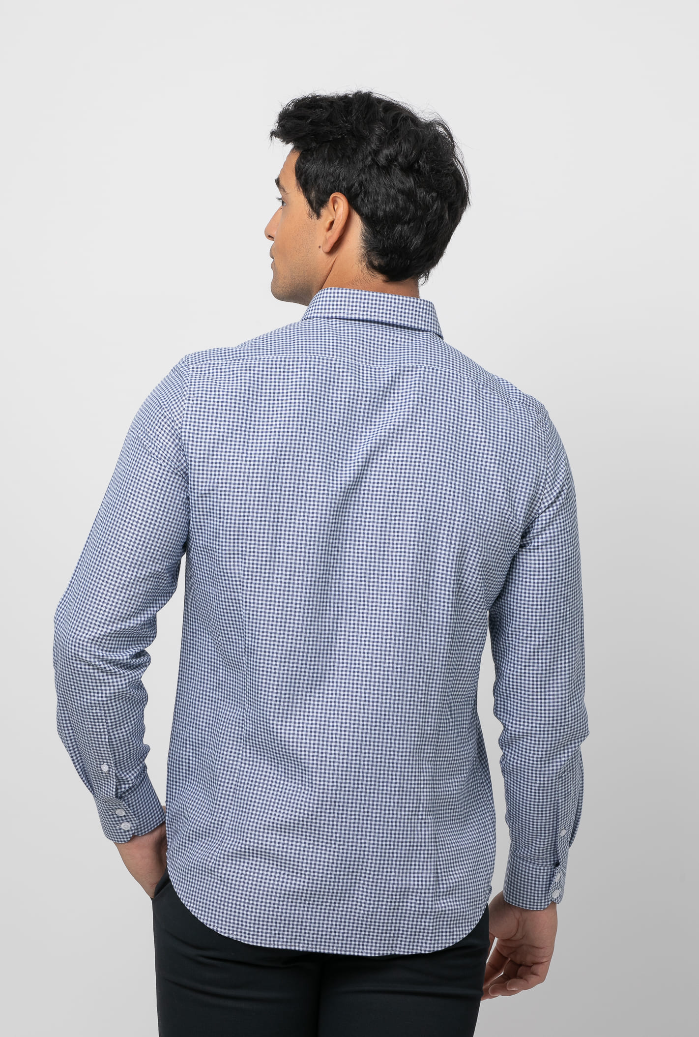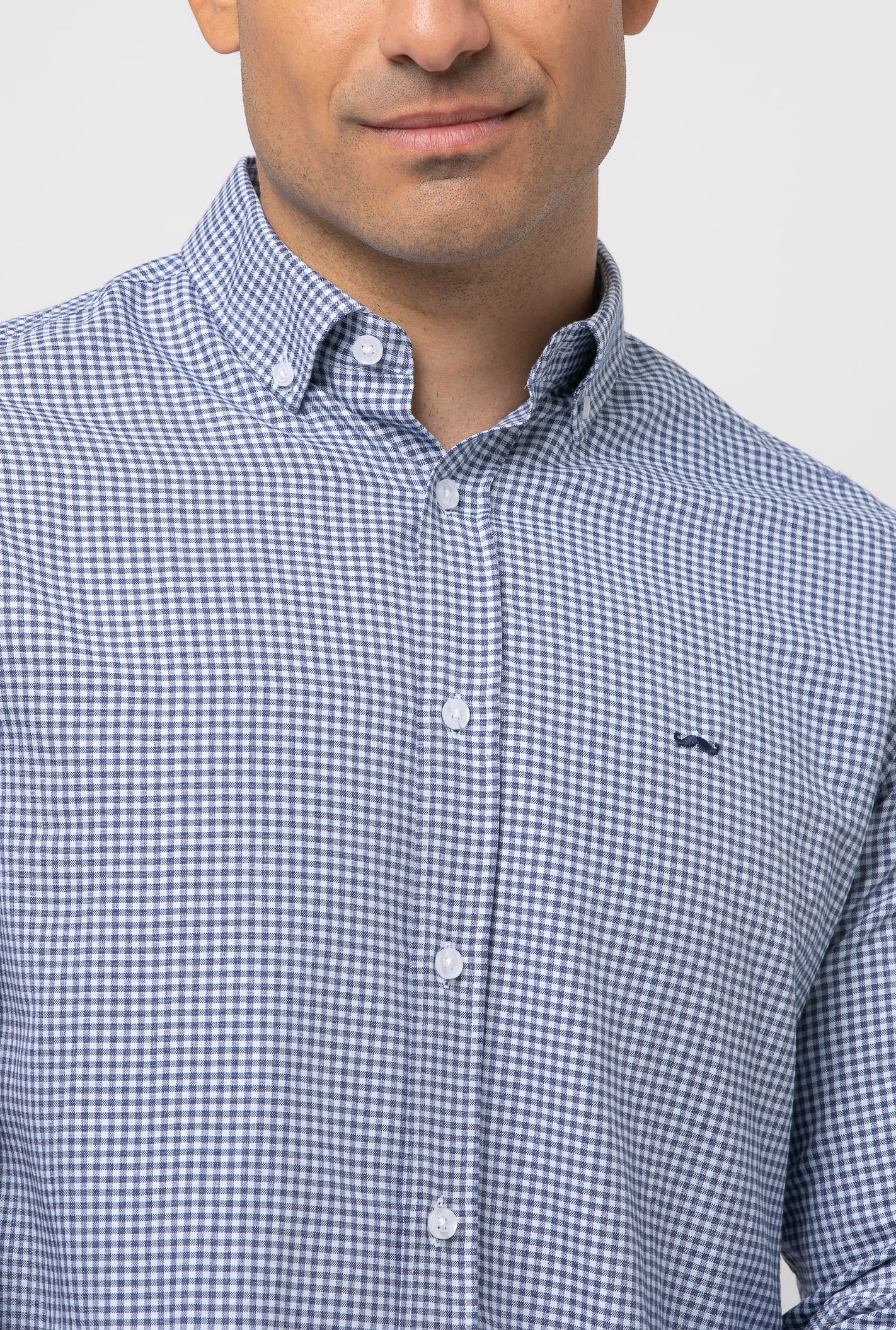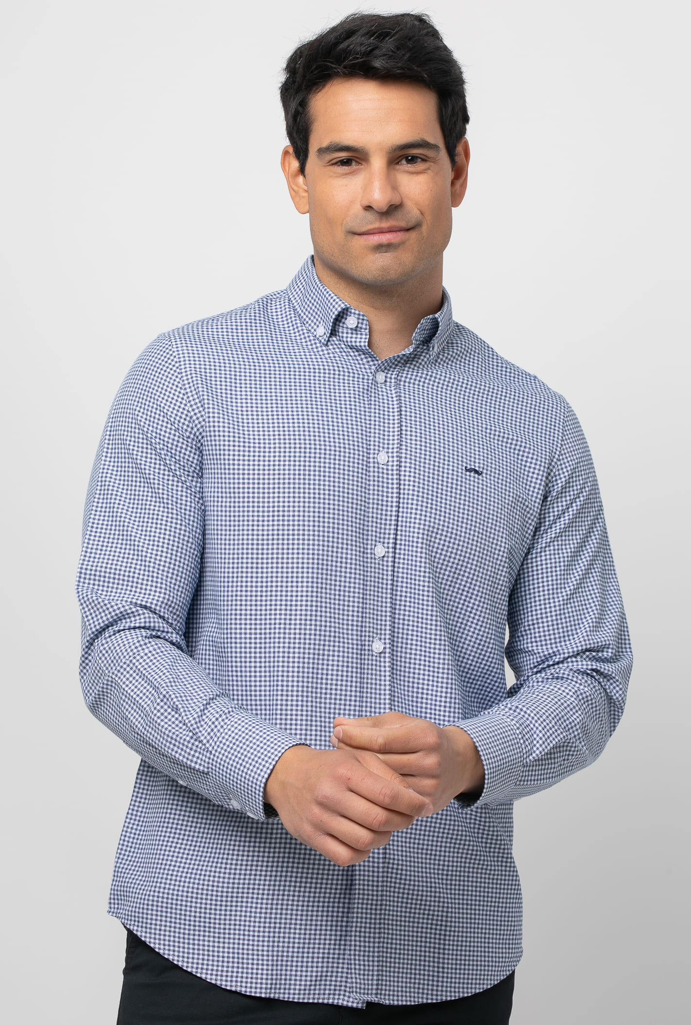 Camisa sport cuadros, Slim fit con pinzas traseras, cuello botón, cierre frontal con tapeta y botones, manga larga con puños abotonados y bordado de la marca en el pecho en contraste