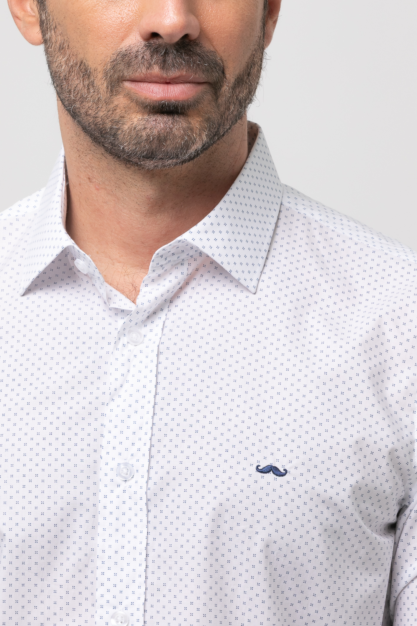 Camisa estampada Slim fit con pinzas traseras, cuello vestir, cierre frontal con botones en tapeta , manga larga con puños abotonados aptos para gemelos y bordado de la marca en el pecho.