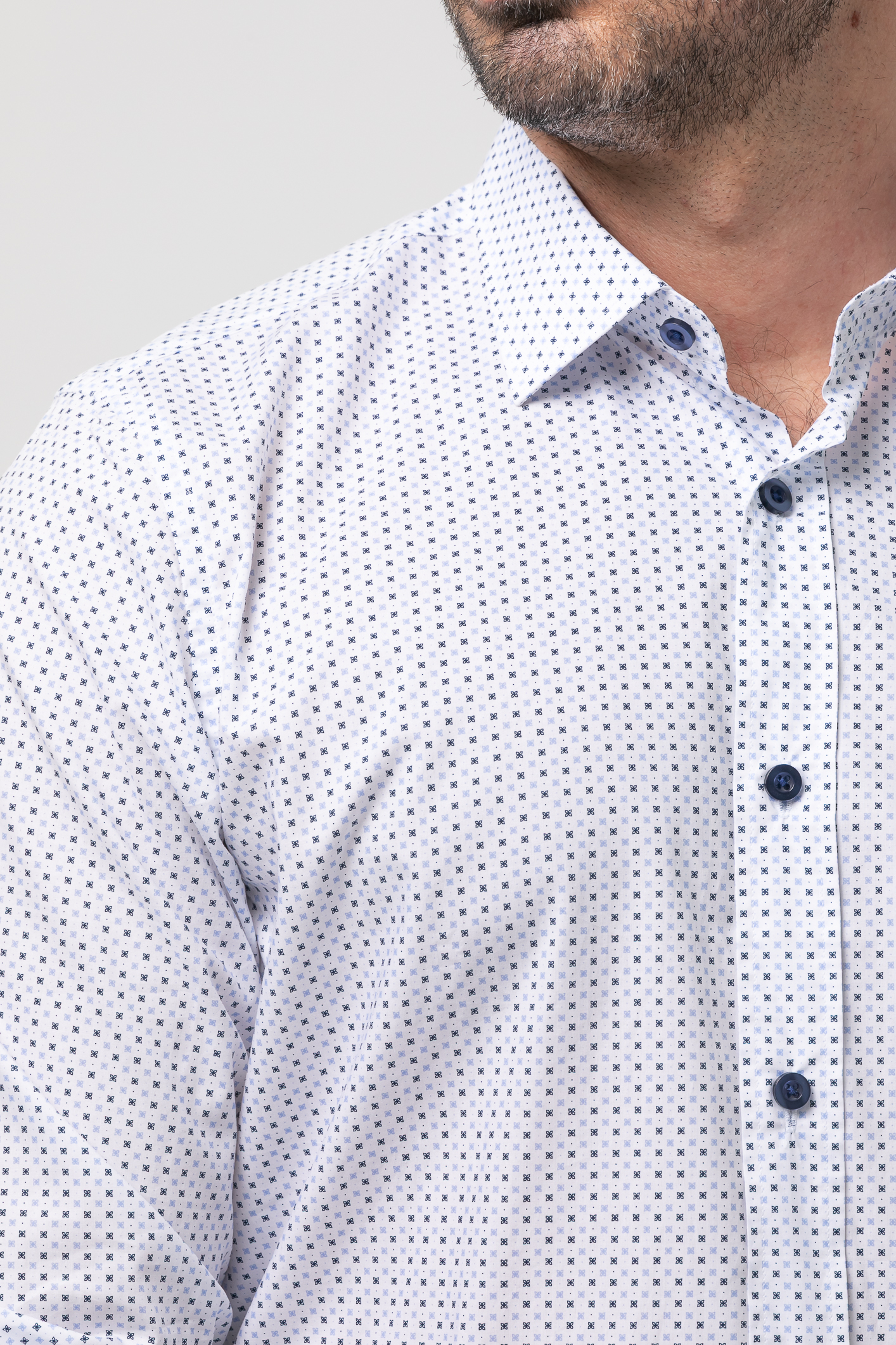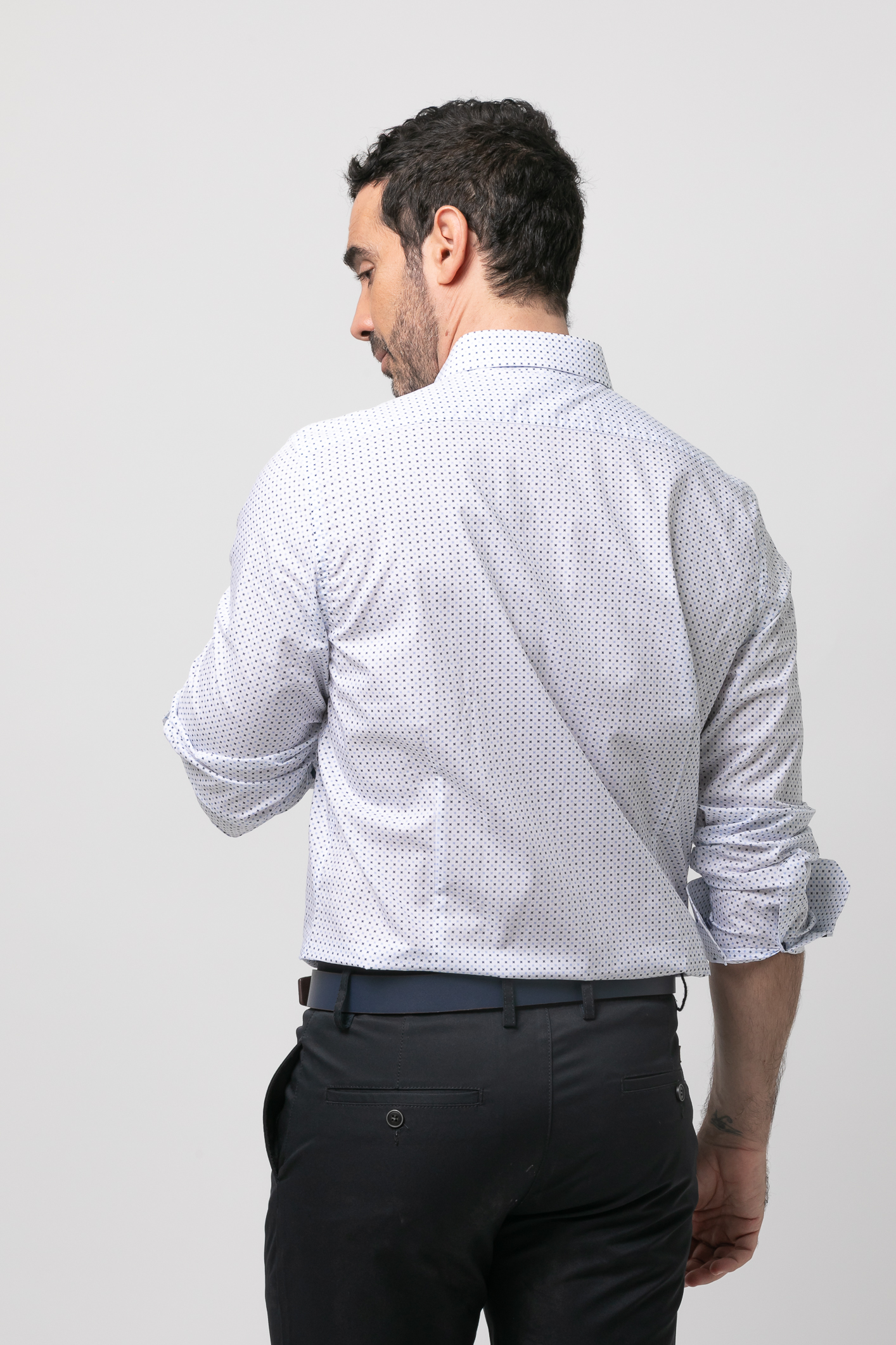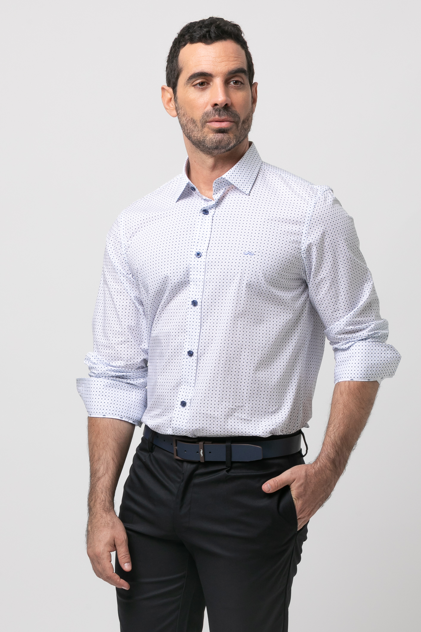 Camisa estampada Slim fit con pinzas traseras, cuello vestir, cierre frontal con botones en tapeta, manga larga con puños abotonados aptos para gemelos y bordado de la marca en el pecho.