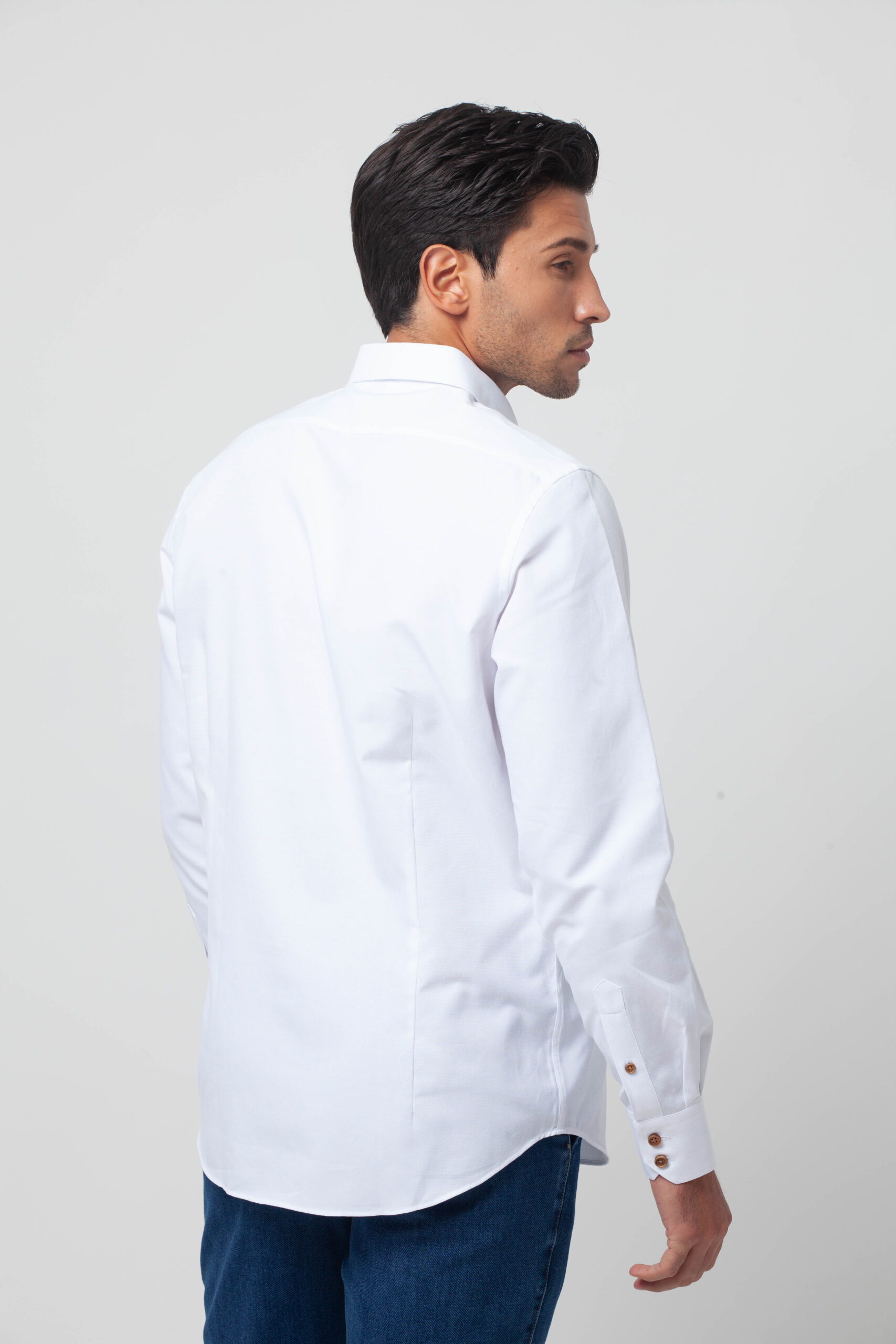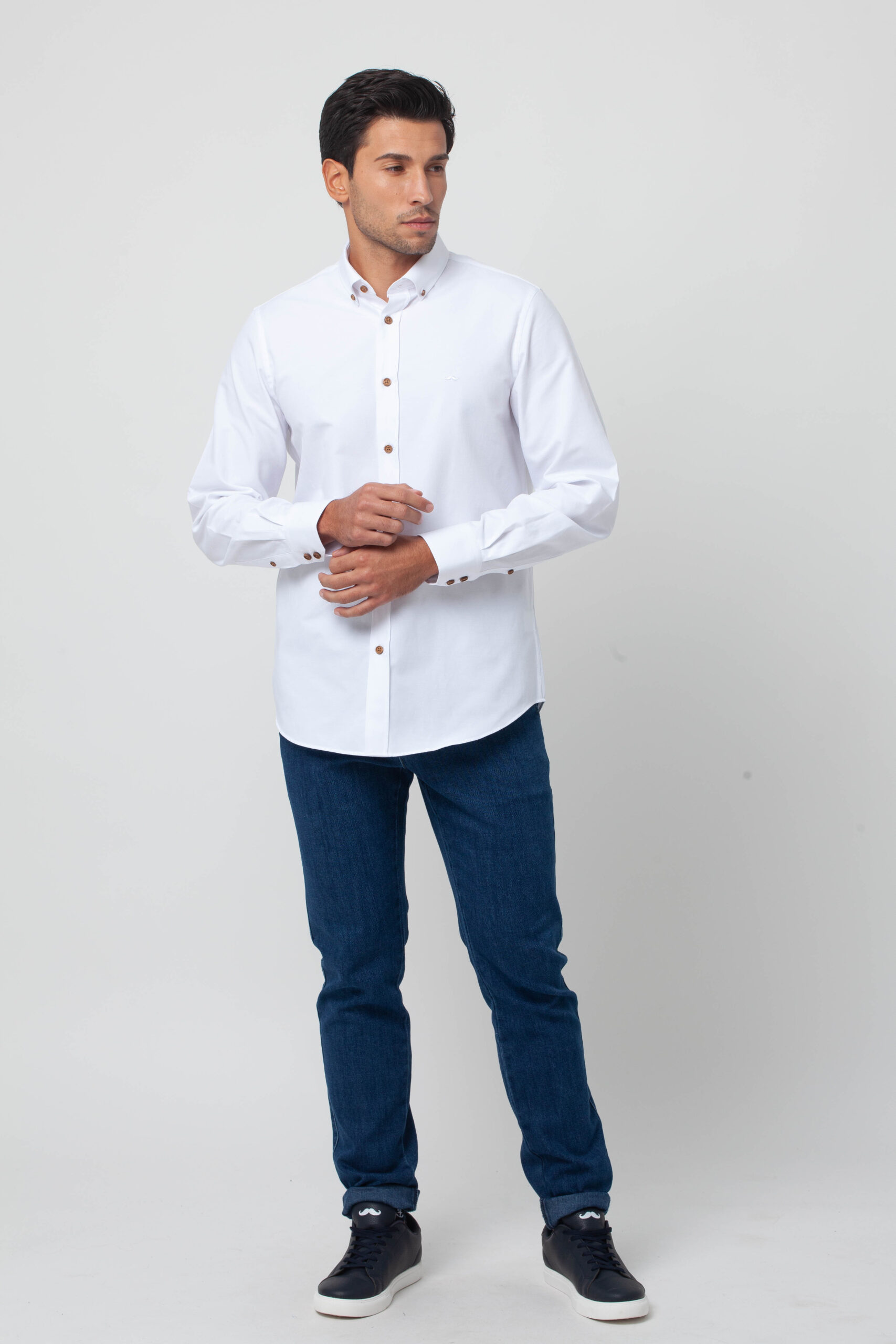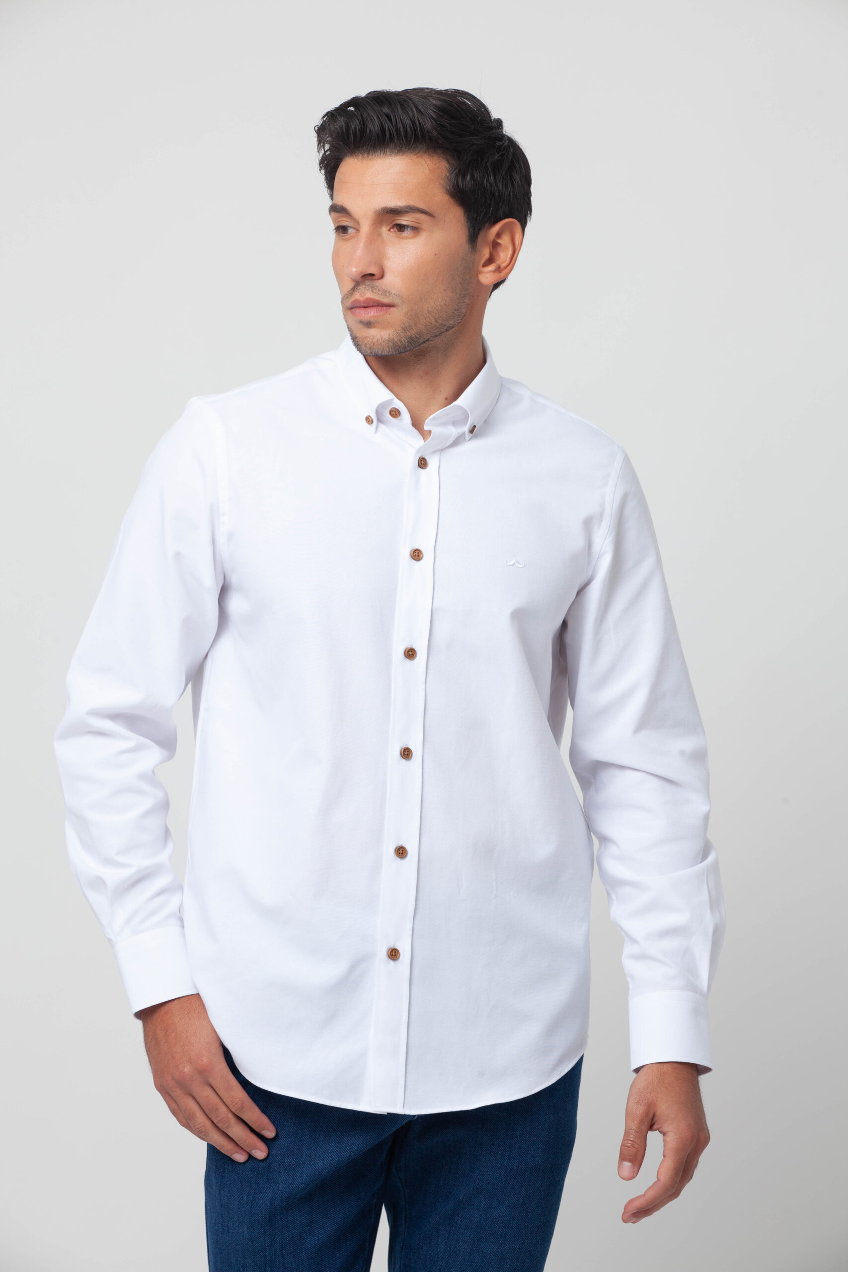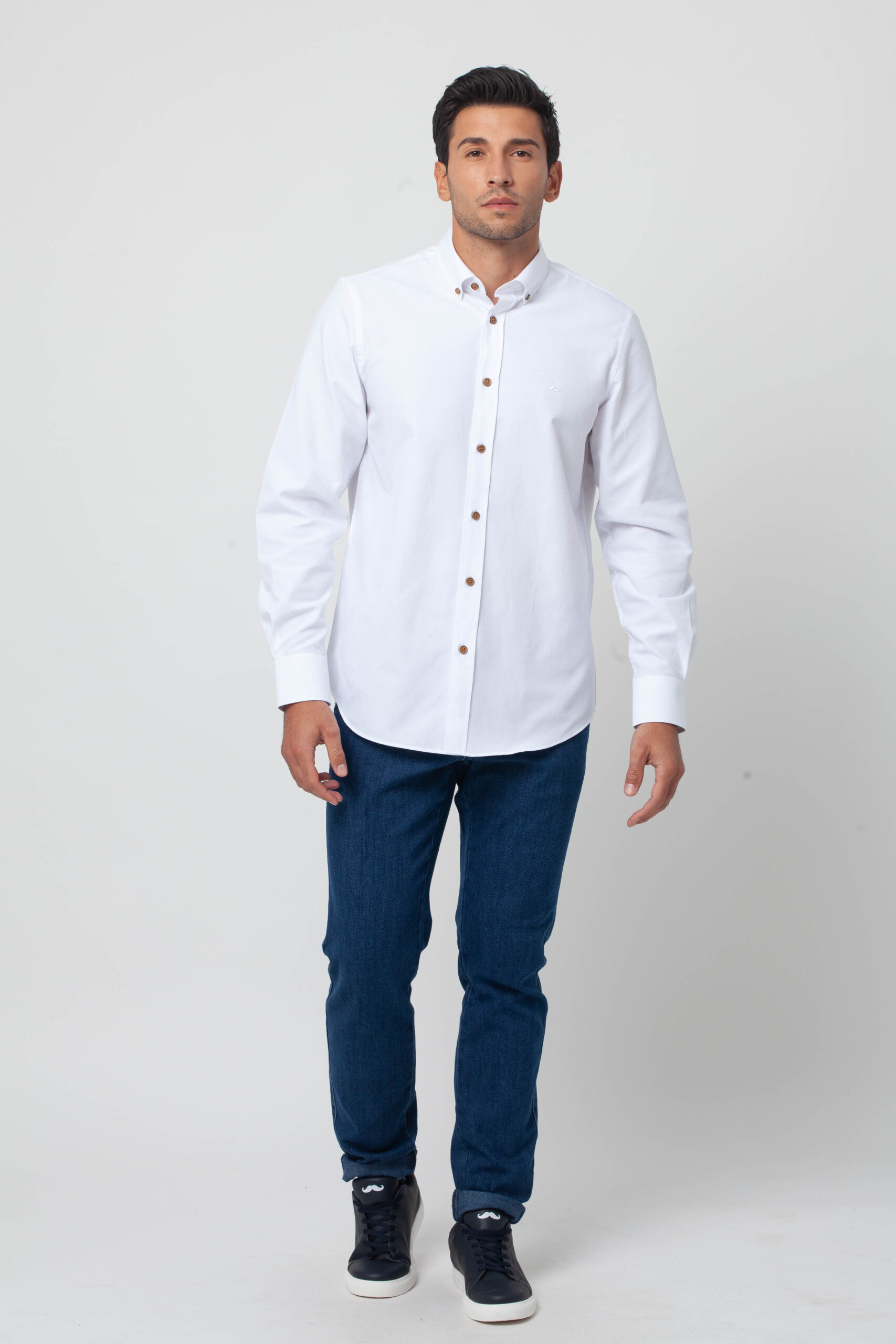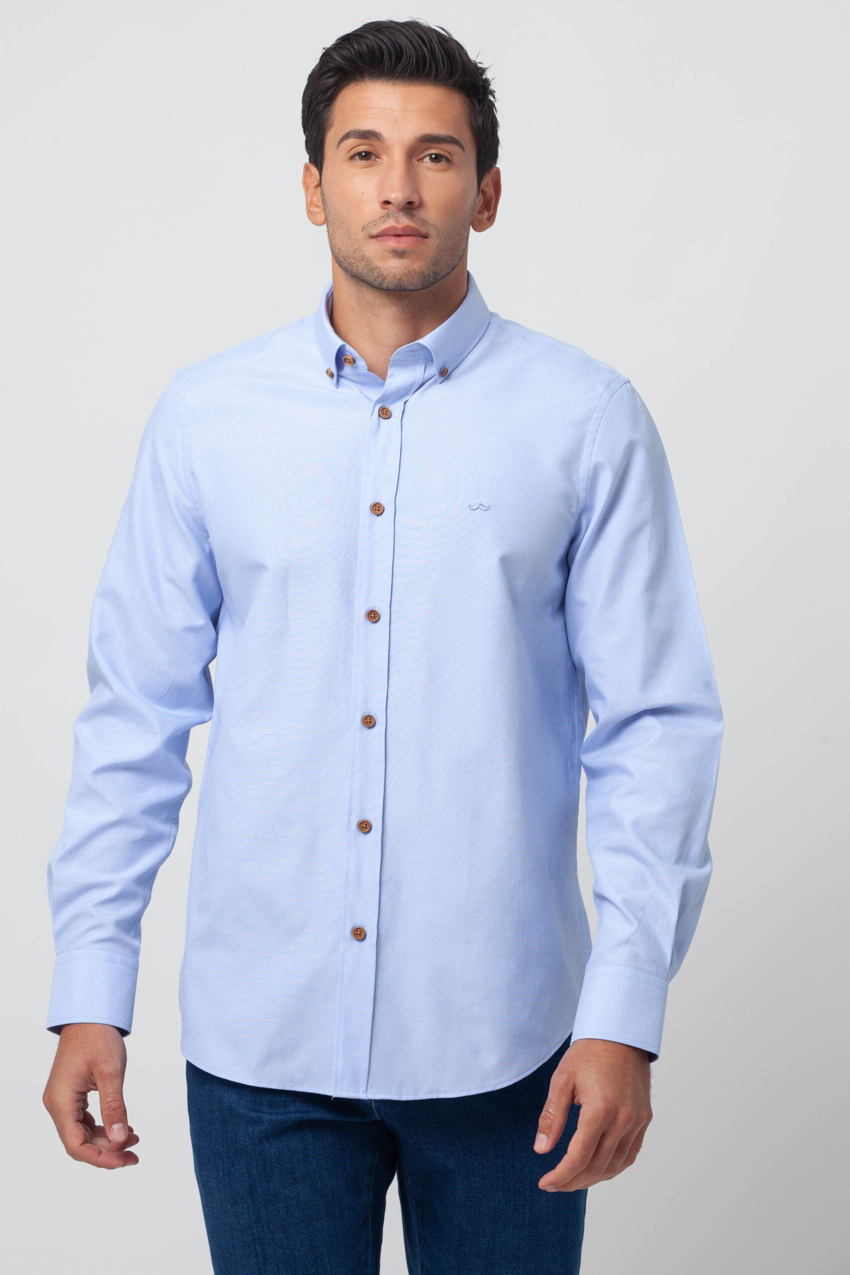 Camisa lisa confeccionada en tejido Oxford. Corte Slim fit con pinzas en la espalda que ensalzan la silueta masculina. Presenta cuello botón y cierre mediante botonadura frontal con botones cosidos en ancla. Bordado de nuestro bigote en el pecho.