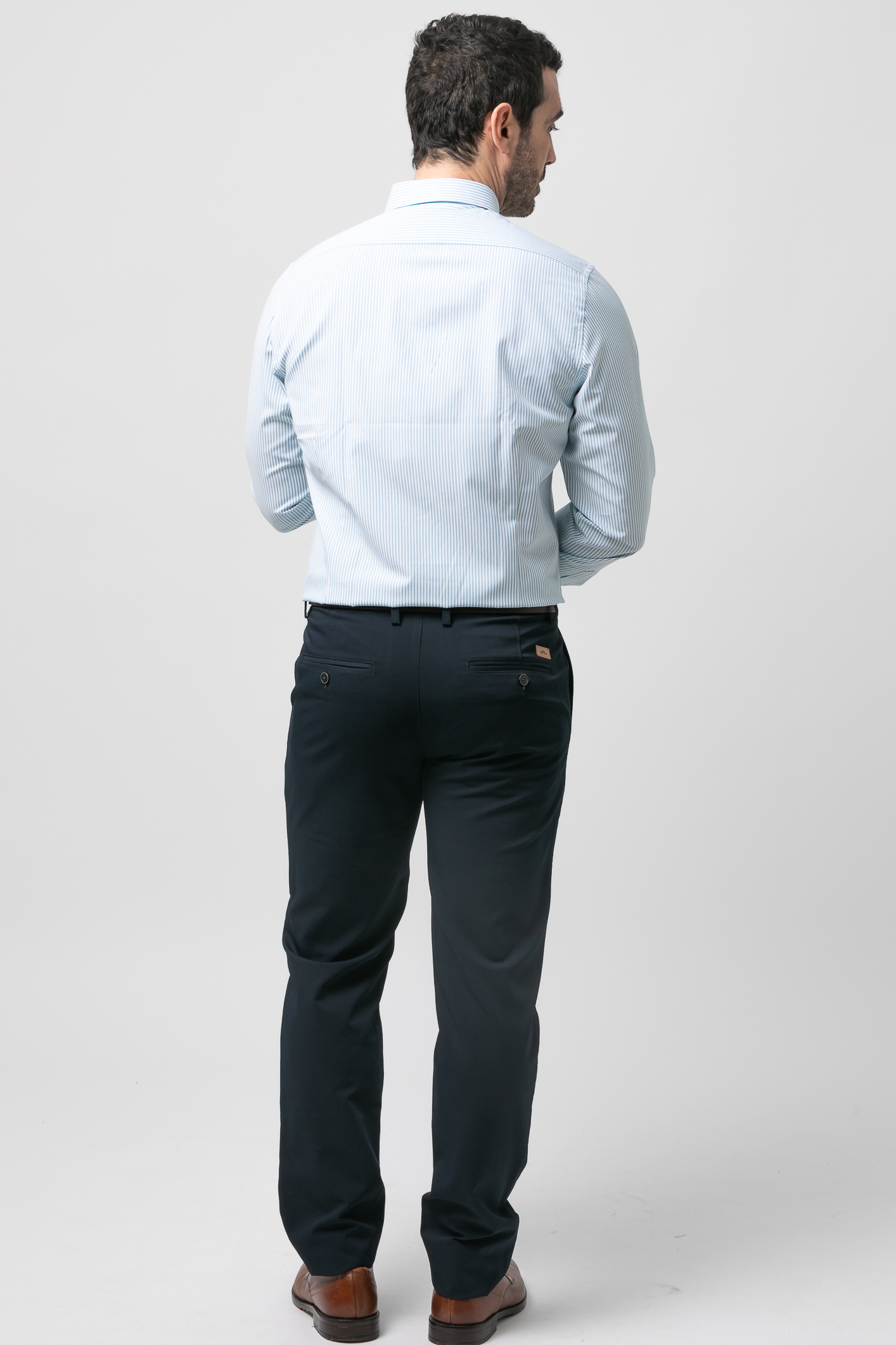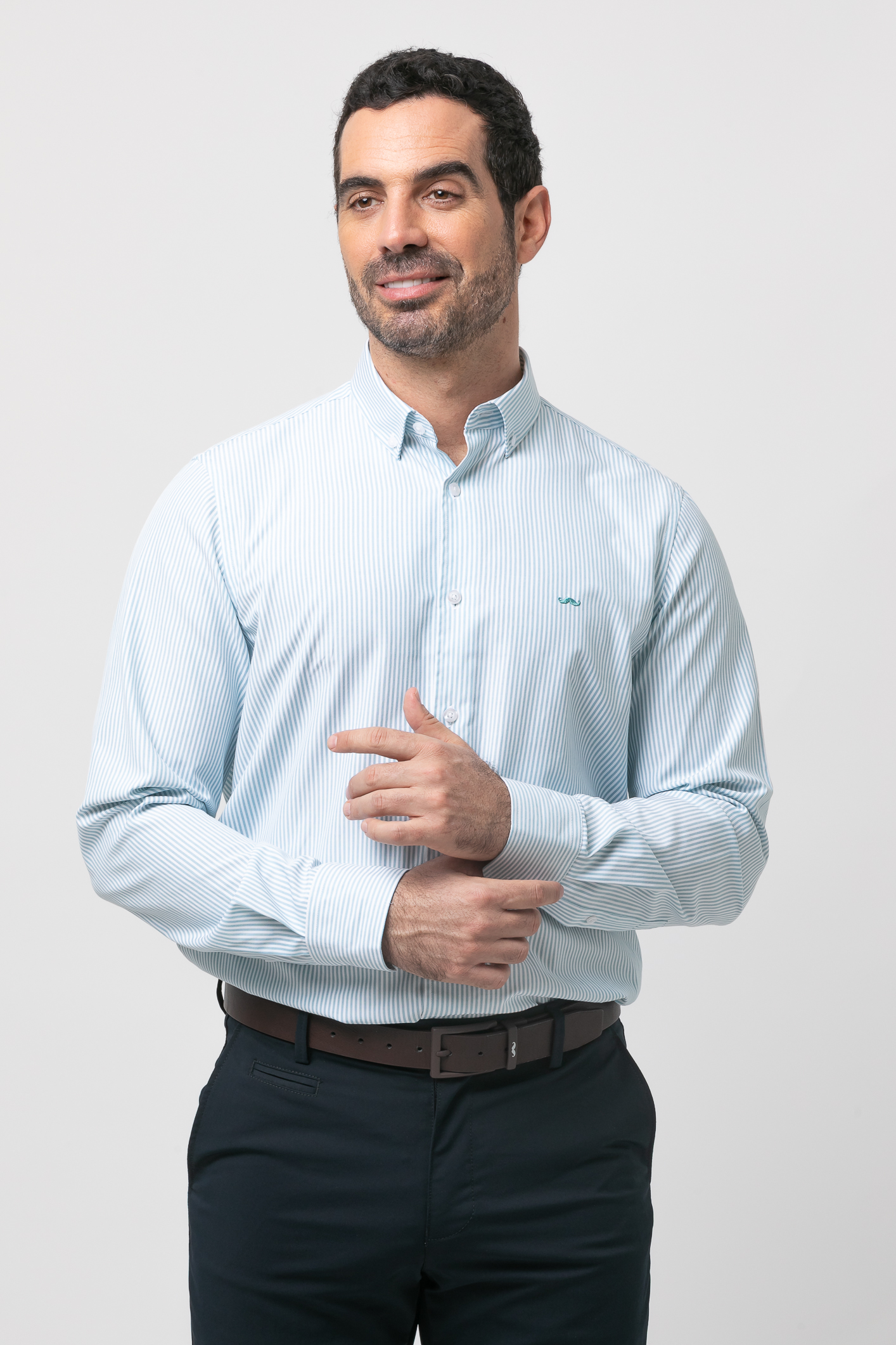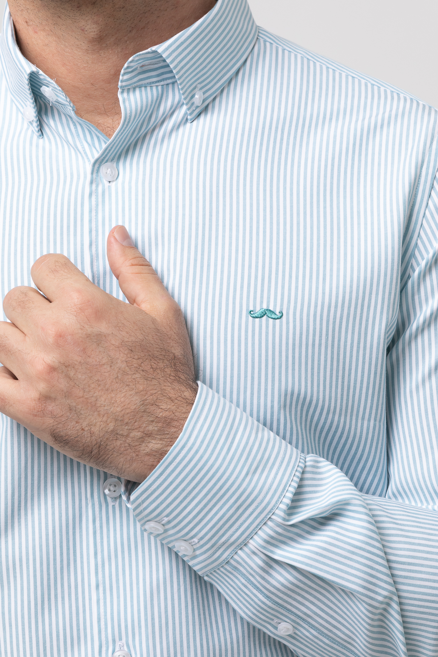 Camisa de rayas con algodón, con cuello botón, cierre frontal de botones, manga larga con puños abotonados y bordado de la marca en el pecho.