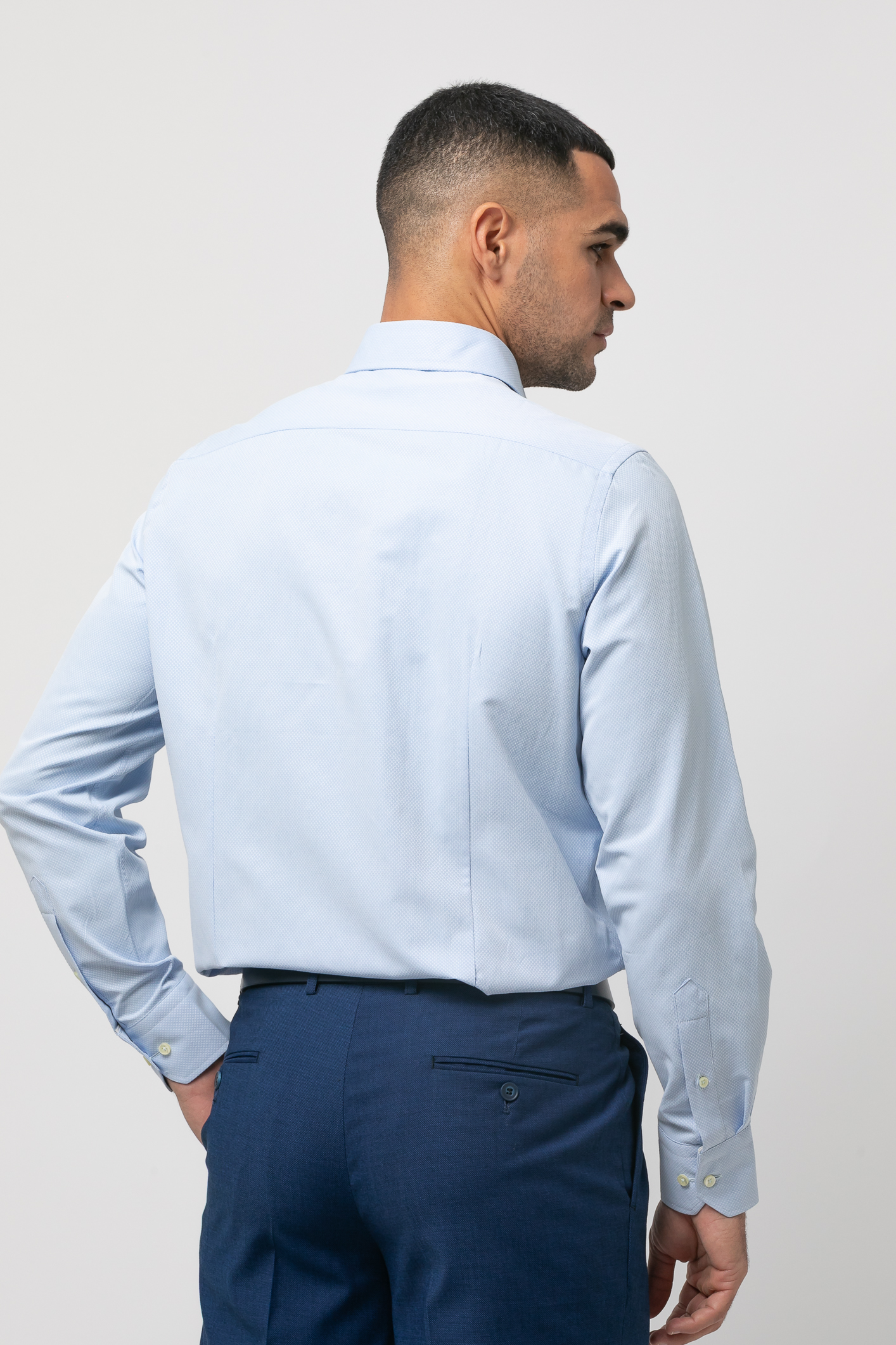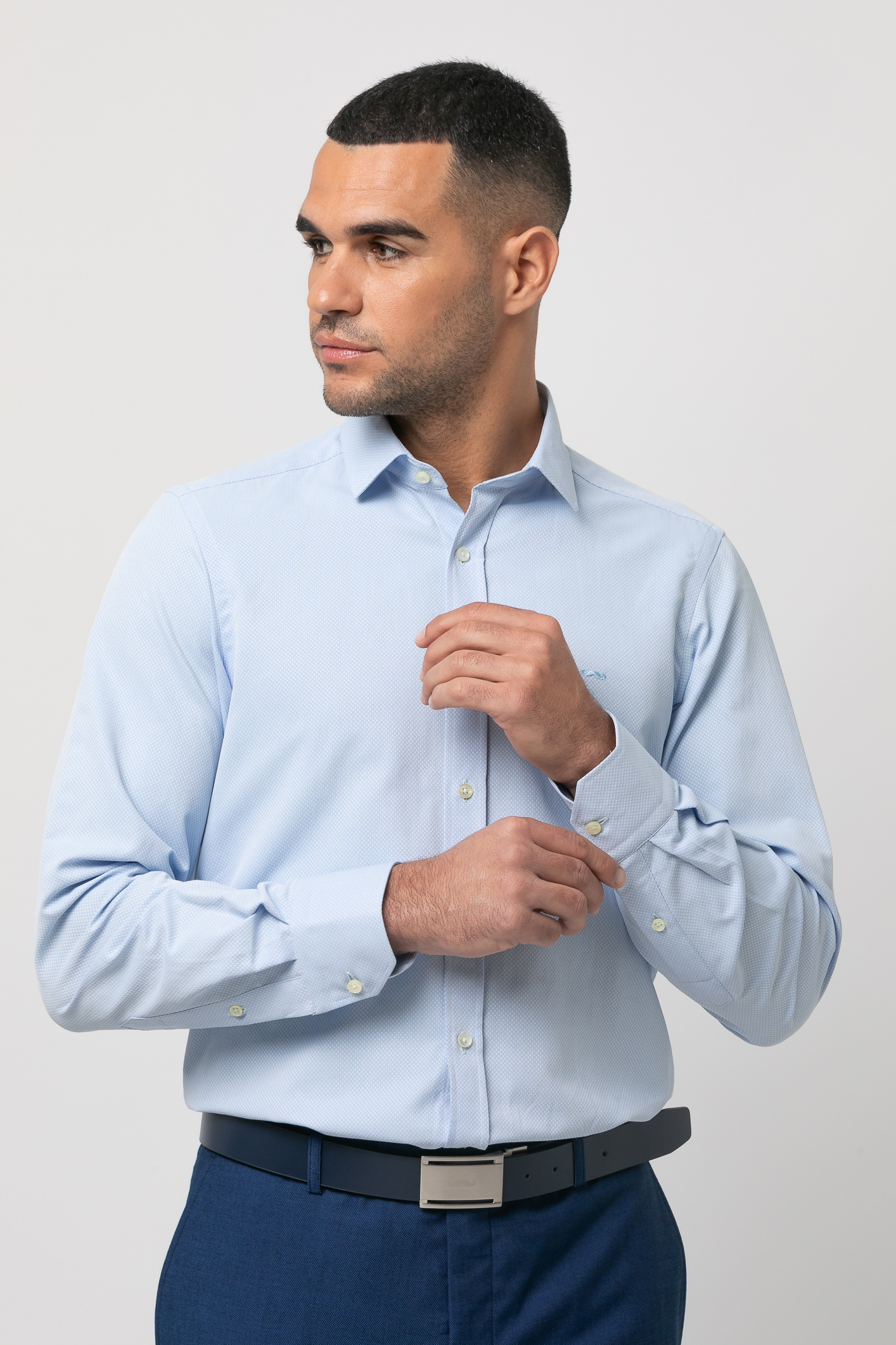 Camisa de vestir falso liso, Slim fit con pinzas en la espalda, cuello clásico, cierre frontal de botones en tapeta , manga larga con puños abotonados aptos para gemelo y bordado de la marca en el pecho al tono.