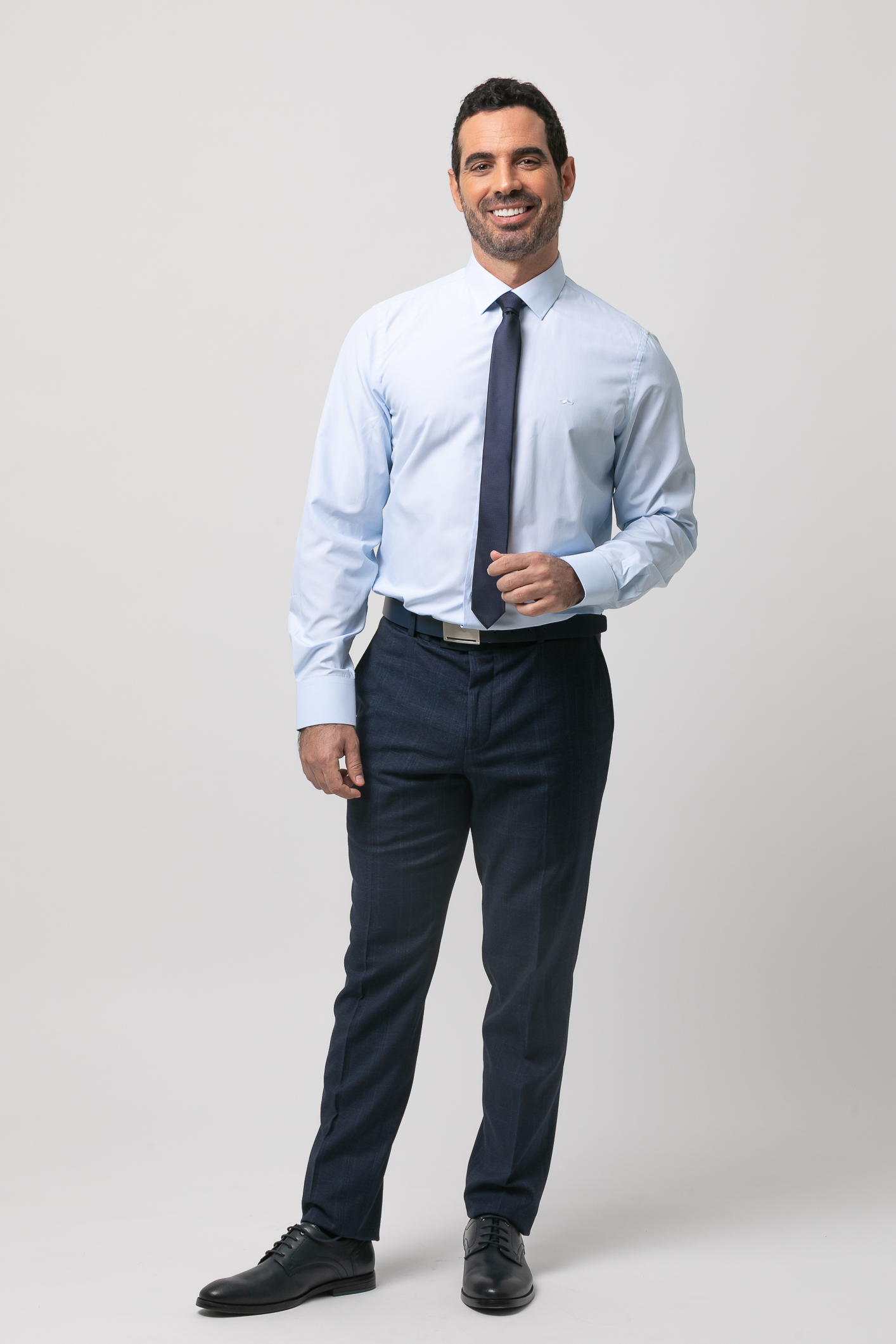 Camisa de vestir falso liso, Slim fit con pinzas en la espalda, cuello clásico, cierre frontal de botones, manga larga con puños abotonados aptos para gemelo y bordado de la marca en el pecho al tono.