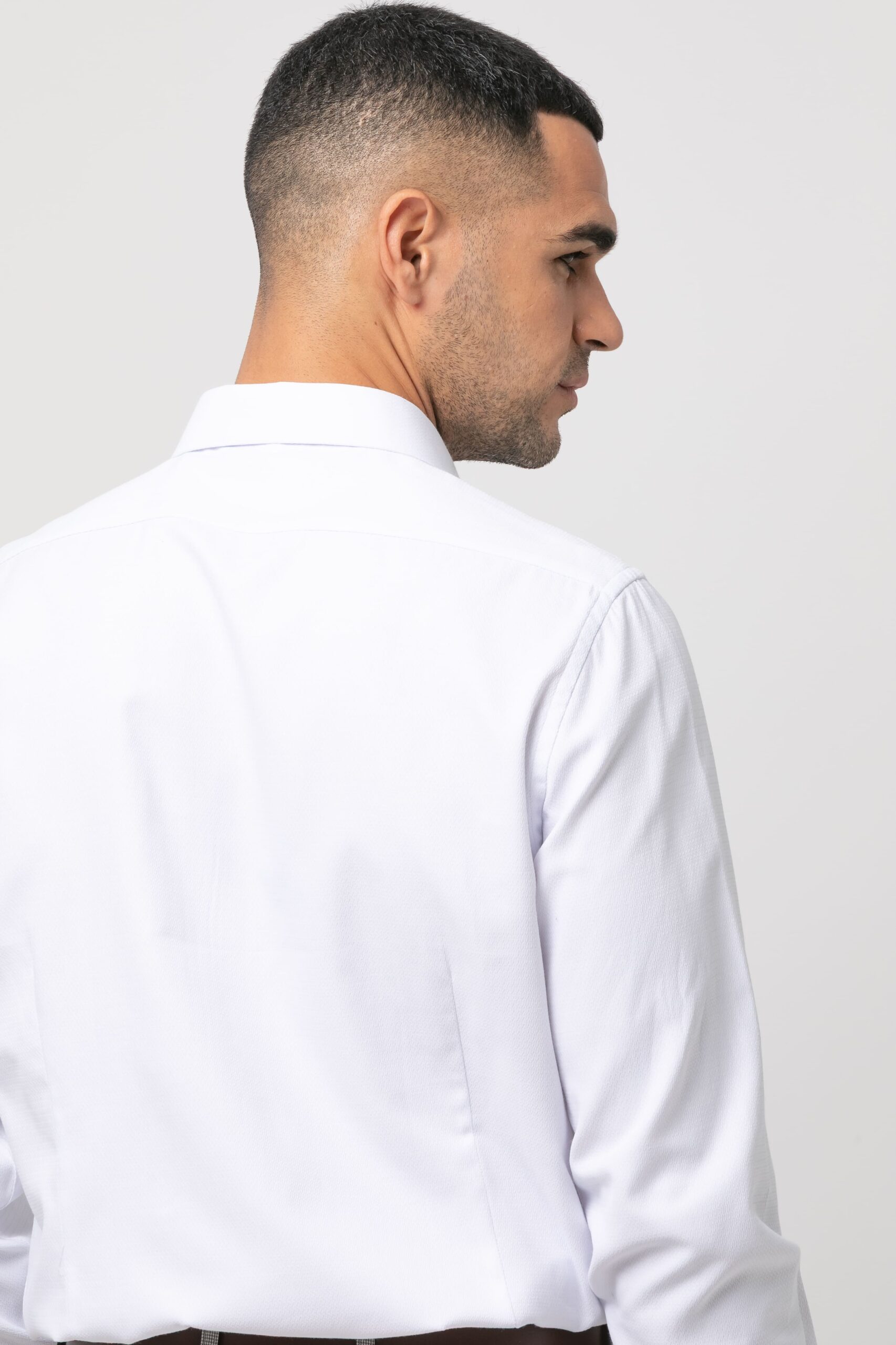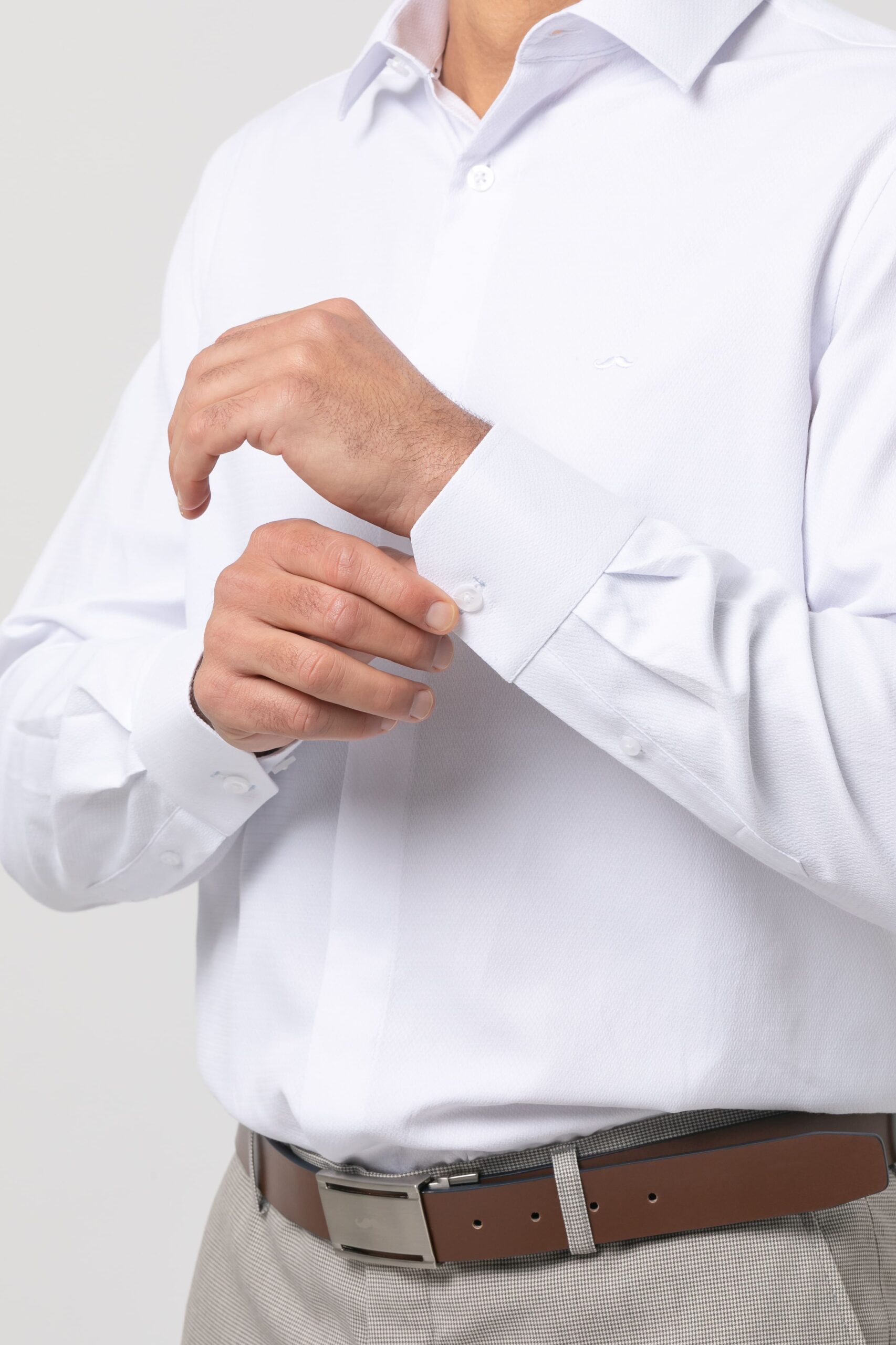 Camisa de vestir falso liso, Slim fit con pinzas en la espalda,cuello clásico, cierre frontal de botones en tapeta, manga larga con puños abotonados aptos para gemelo y bordado de la marca en el pecho al tono.