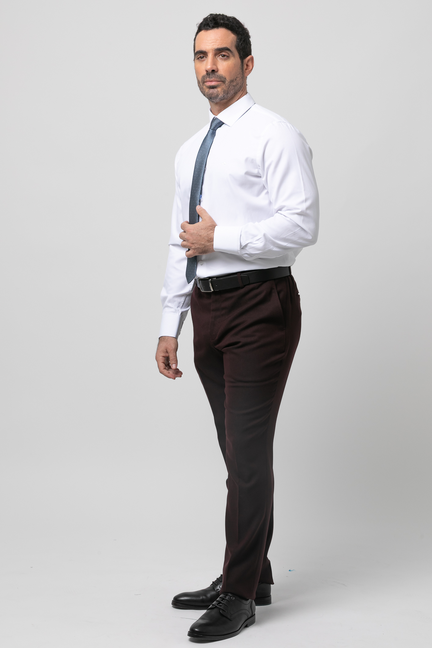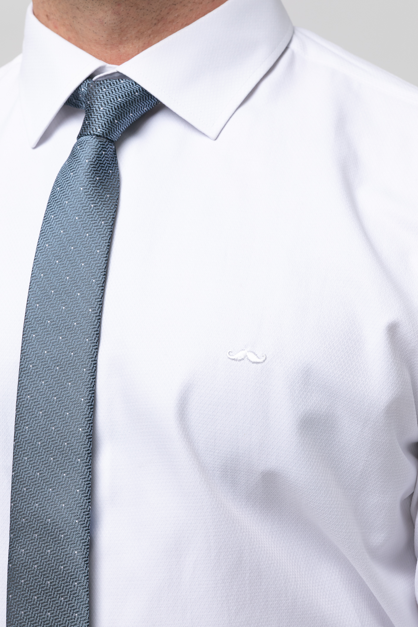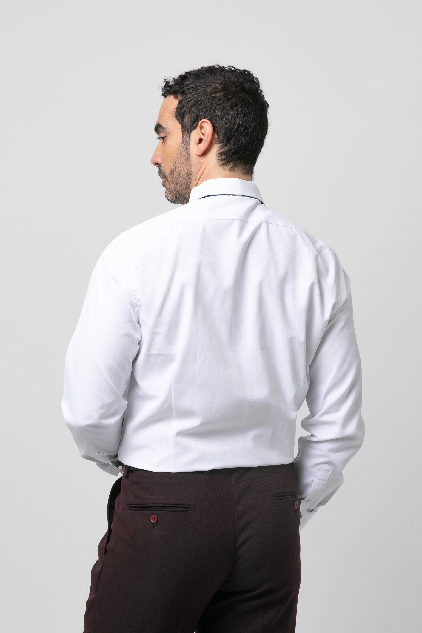 Camisa de vestir falso liso, Slim fit con pinzas en la espalda, cuello clásico, cierre frontal de botones, manga larga con puños abotonados aptos para gemelo y bordado de la marca en el pecho al tono.