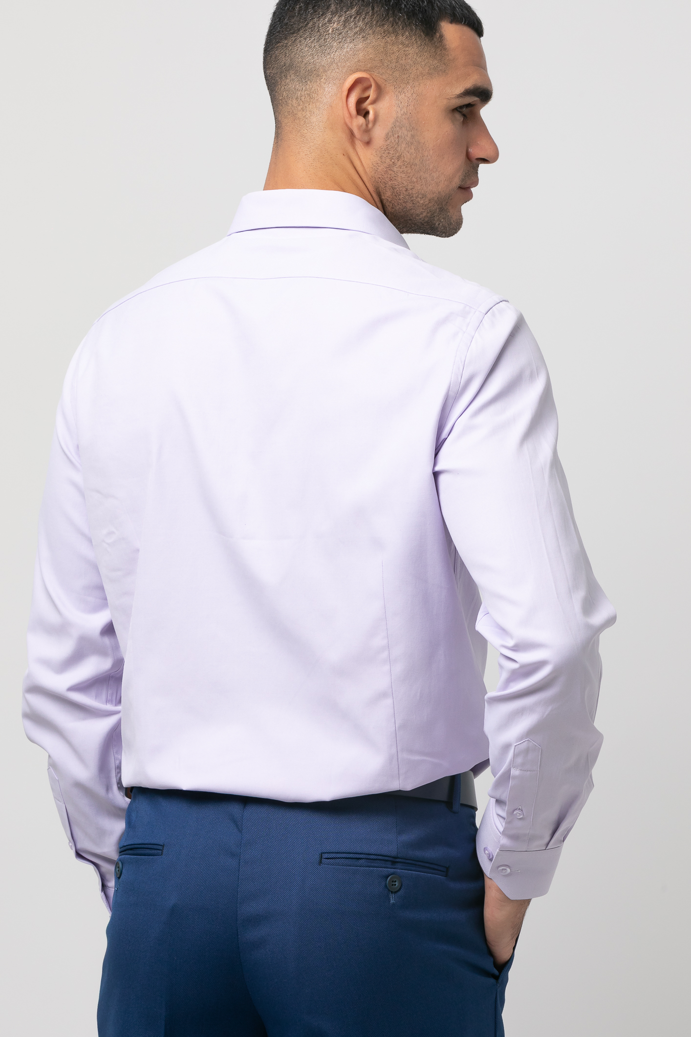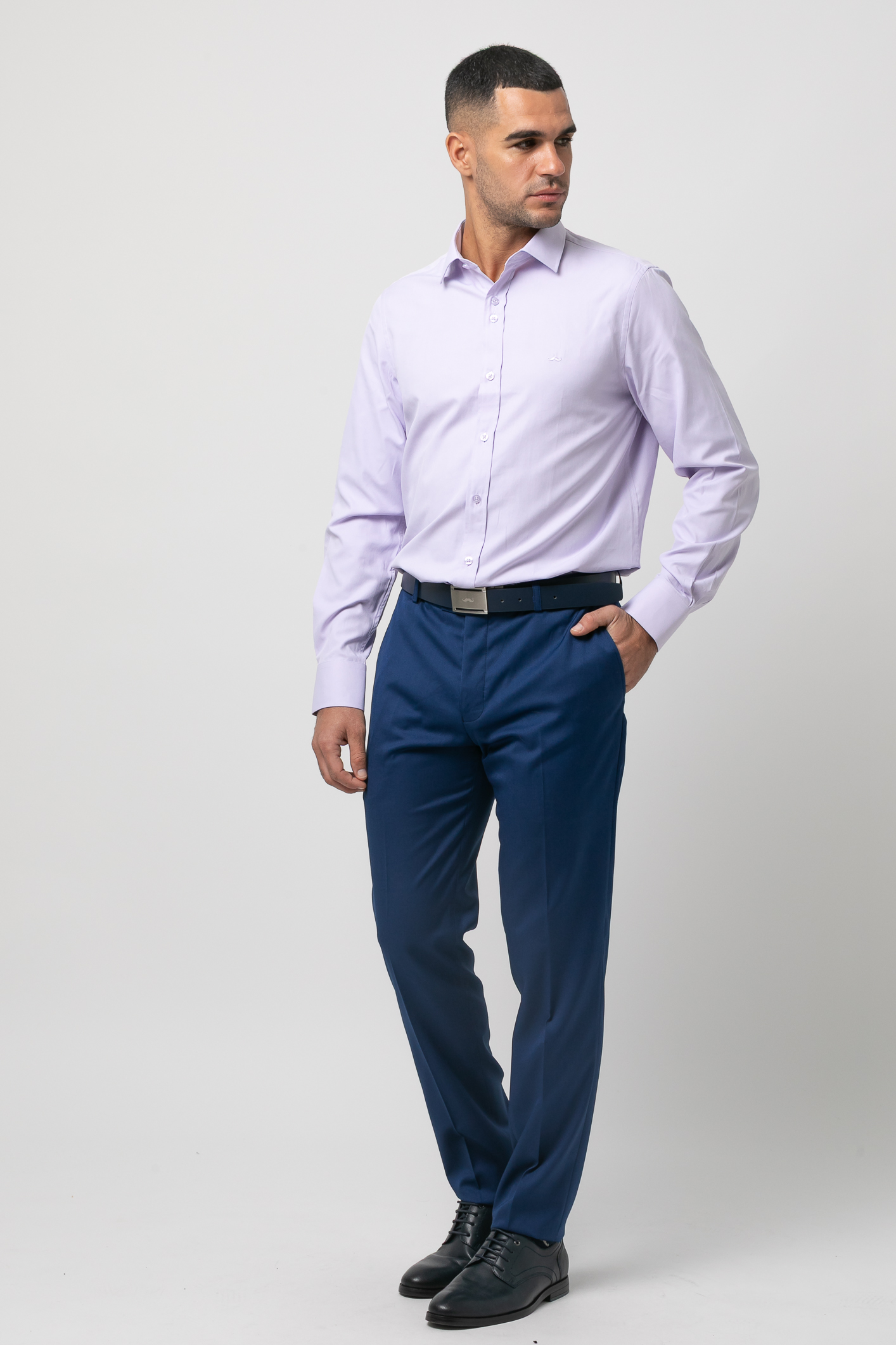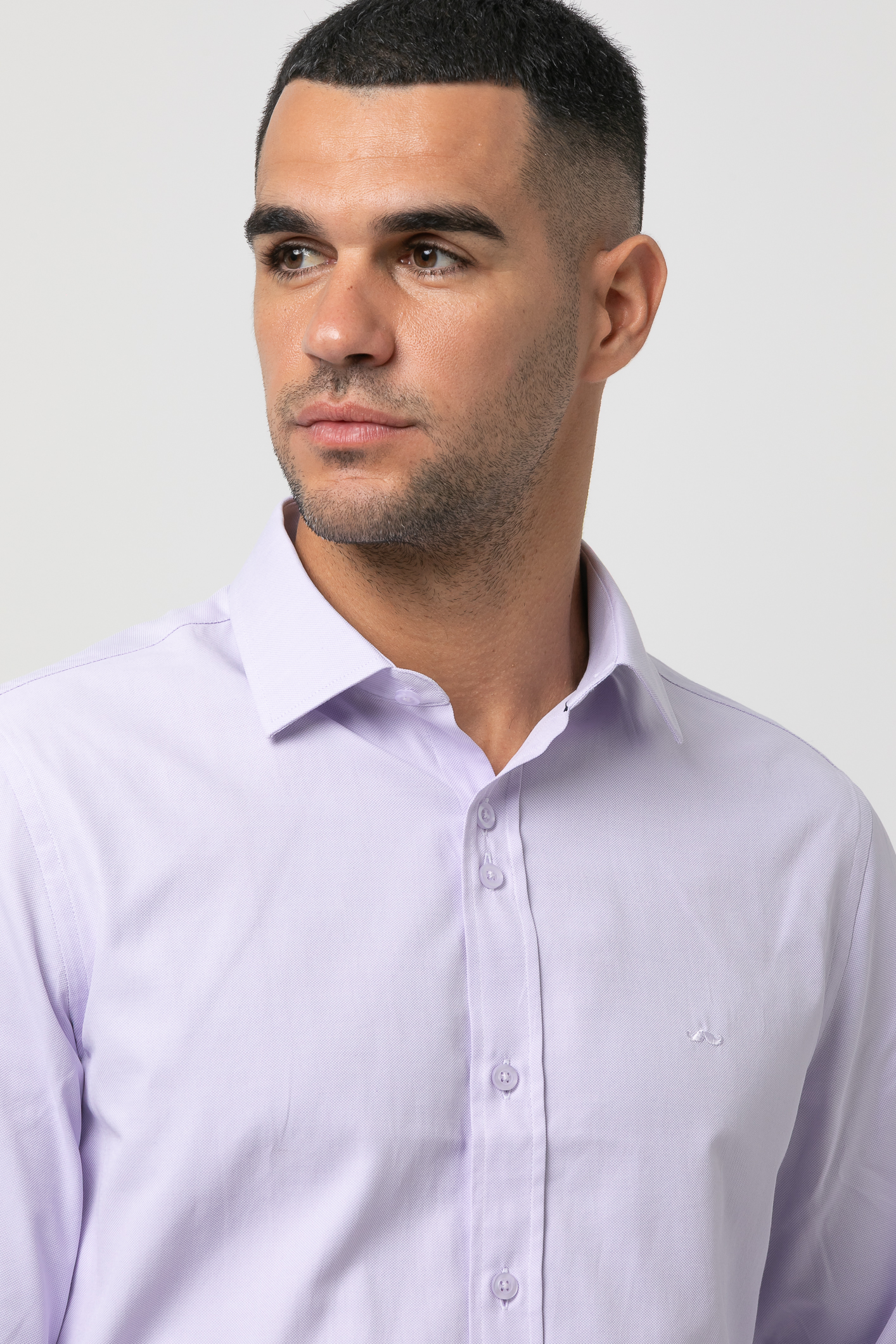 Camisa de vestir falso liso, Slim fit con pinzas en la espalda en tejido mezcla con cuello clásico, cierre frontal de botones en tapeta, manga larga con puños abotonados aptos para gemelo y bordado de la marca en el pecho al tono.