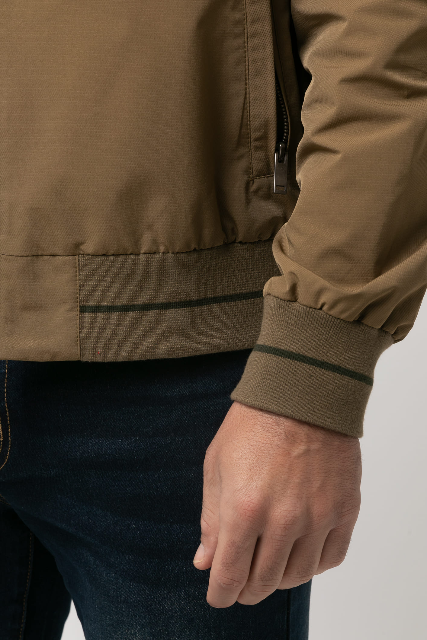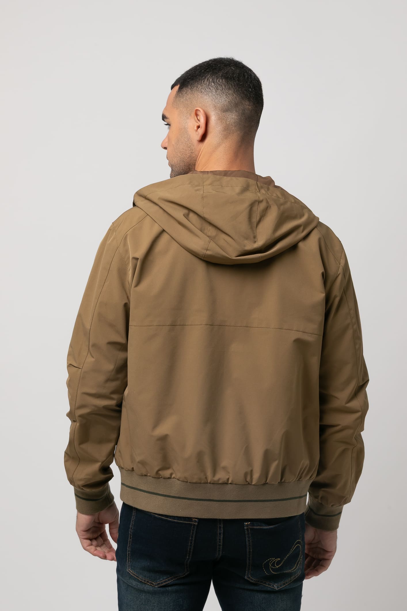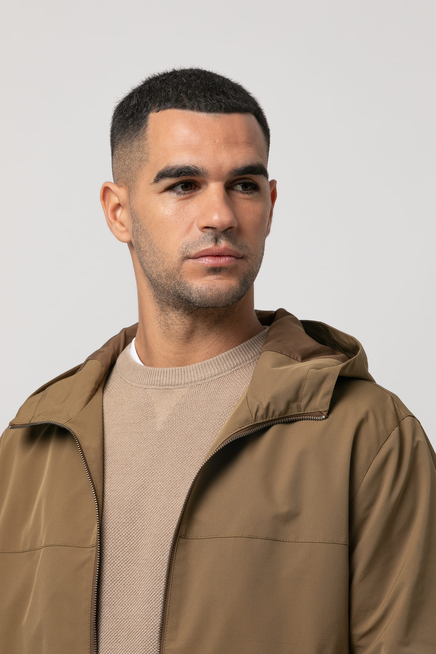 Cazadora tejido técnico con capucha, detalles interiores contrastados y dos bolsillos frontales con cremallera. Cierre frontal con cremallera.