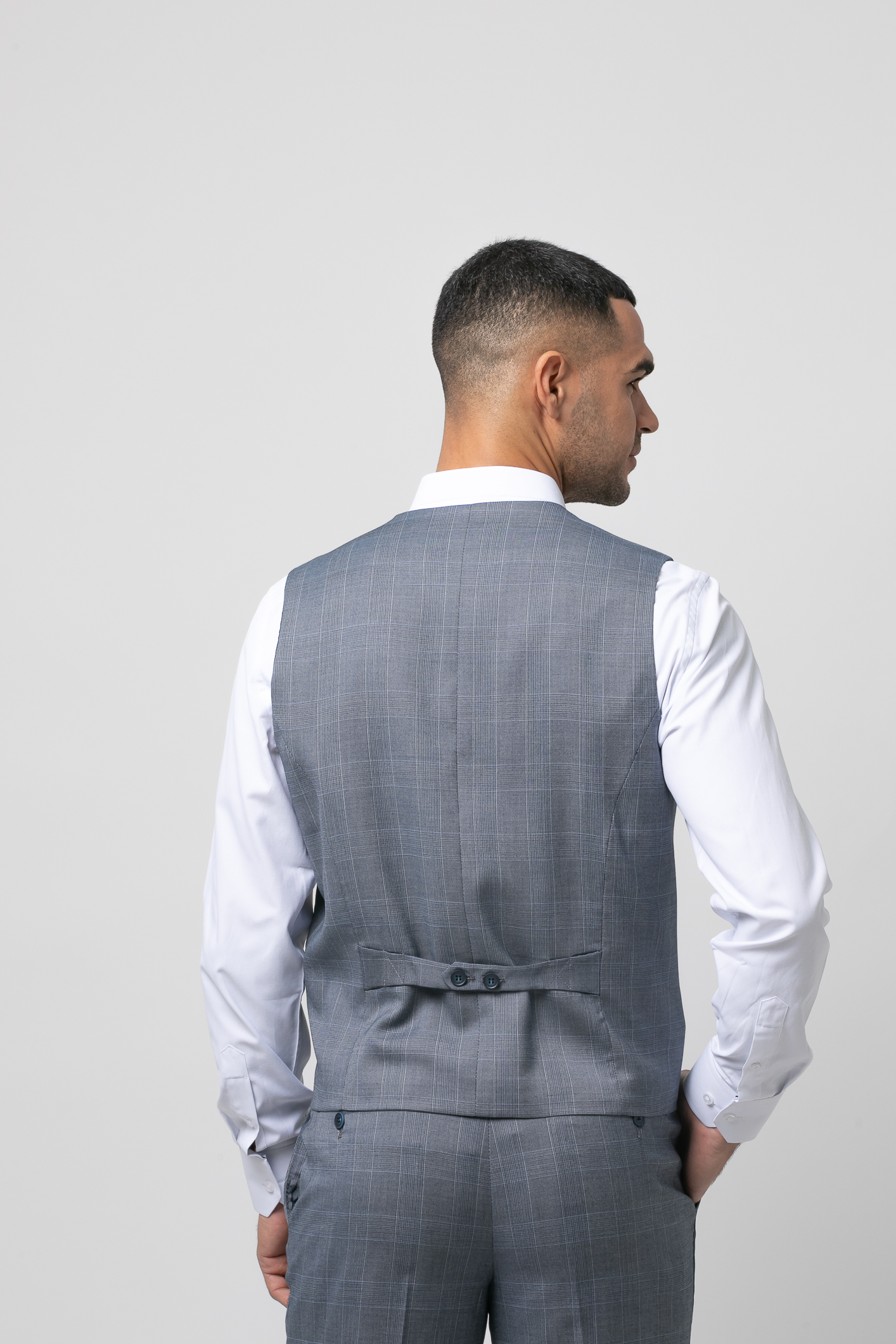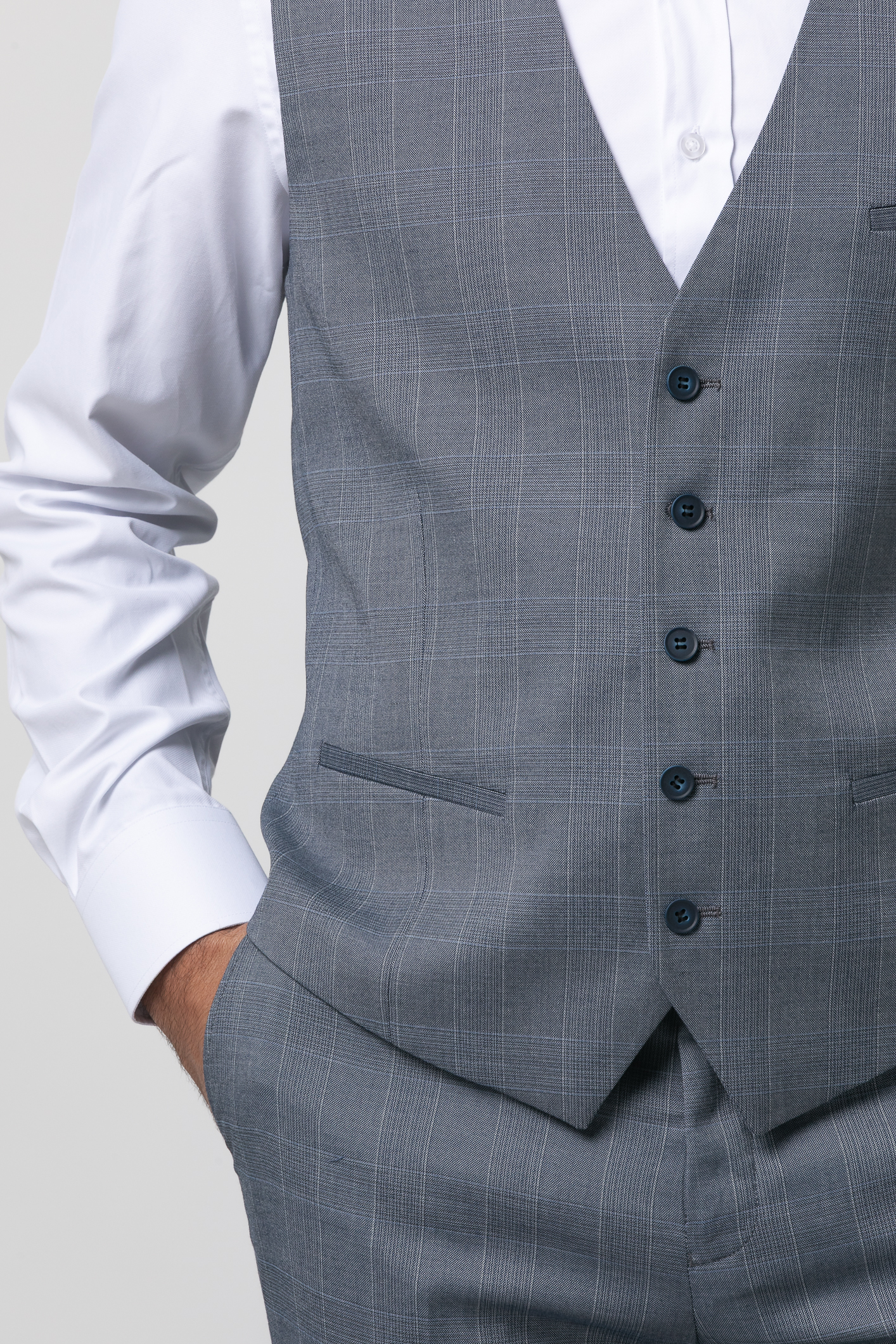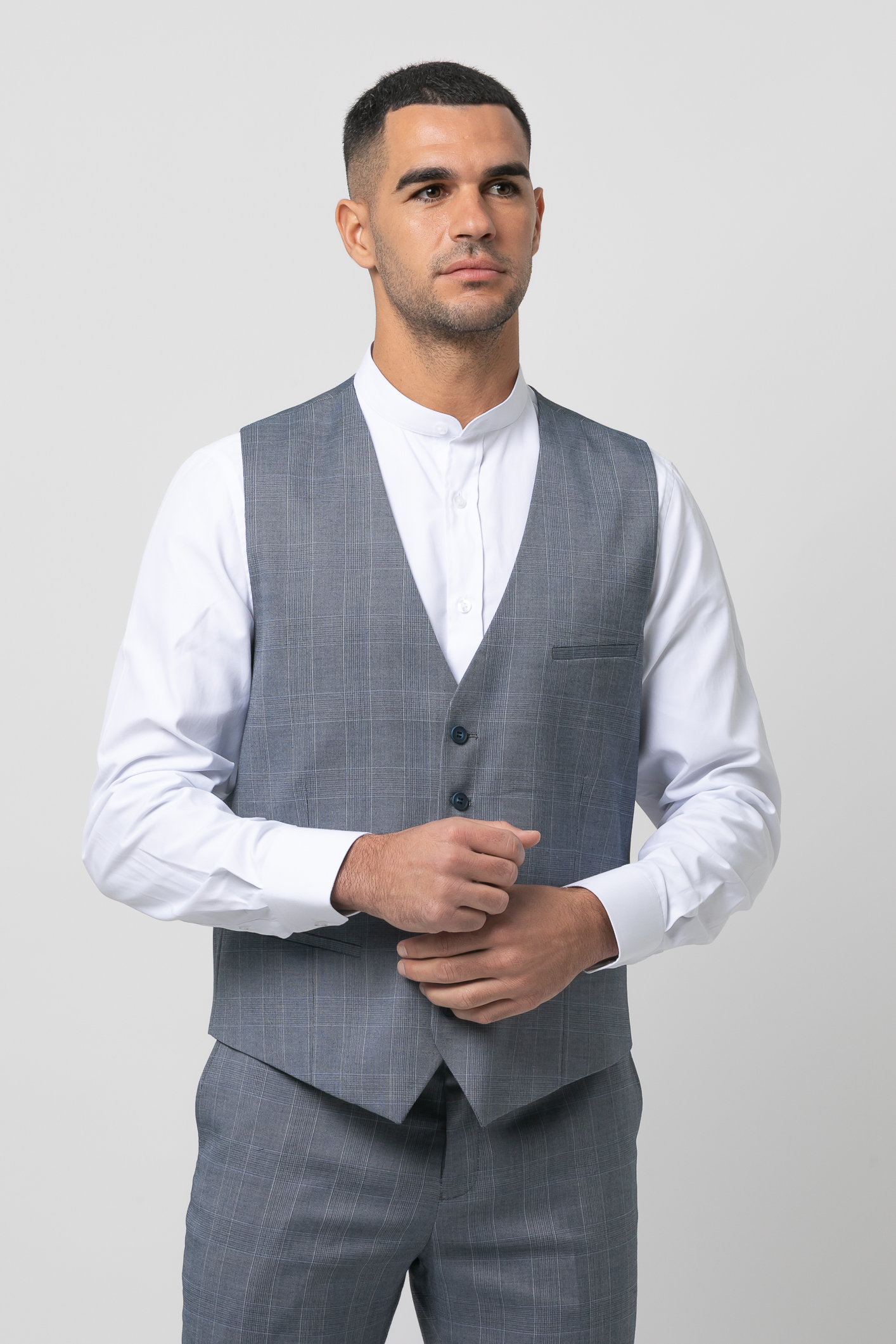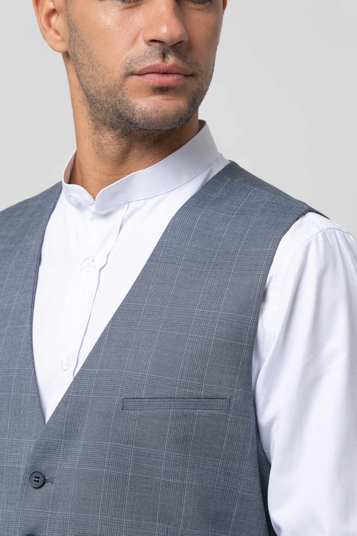 Chaleco de traje en tejido de cuadros con elastano. Presenta cuello pico, cierre mediante botonadura frontal, dos bolsillos de vivo, banda ajustable por botones en la parte posterior y forro interior de fantasía. También está disponible la americana y el pantalón que completará el traje de tres piezas.