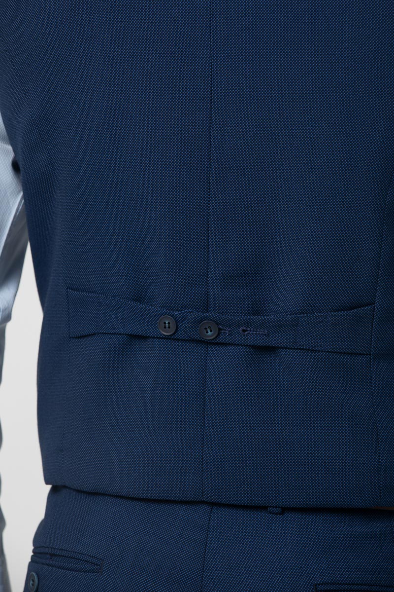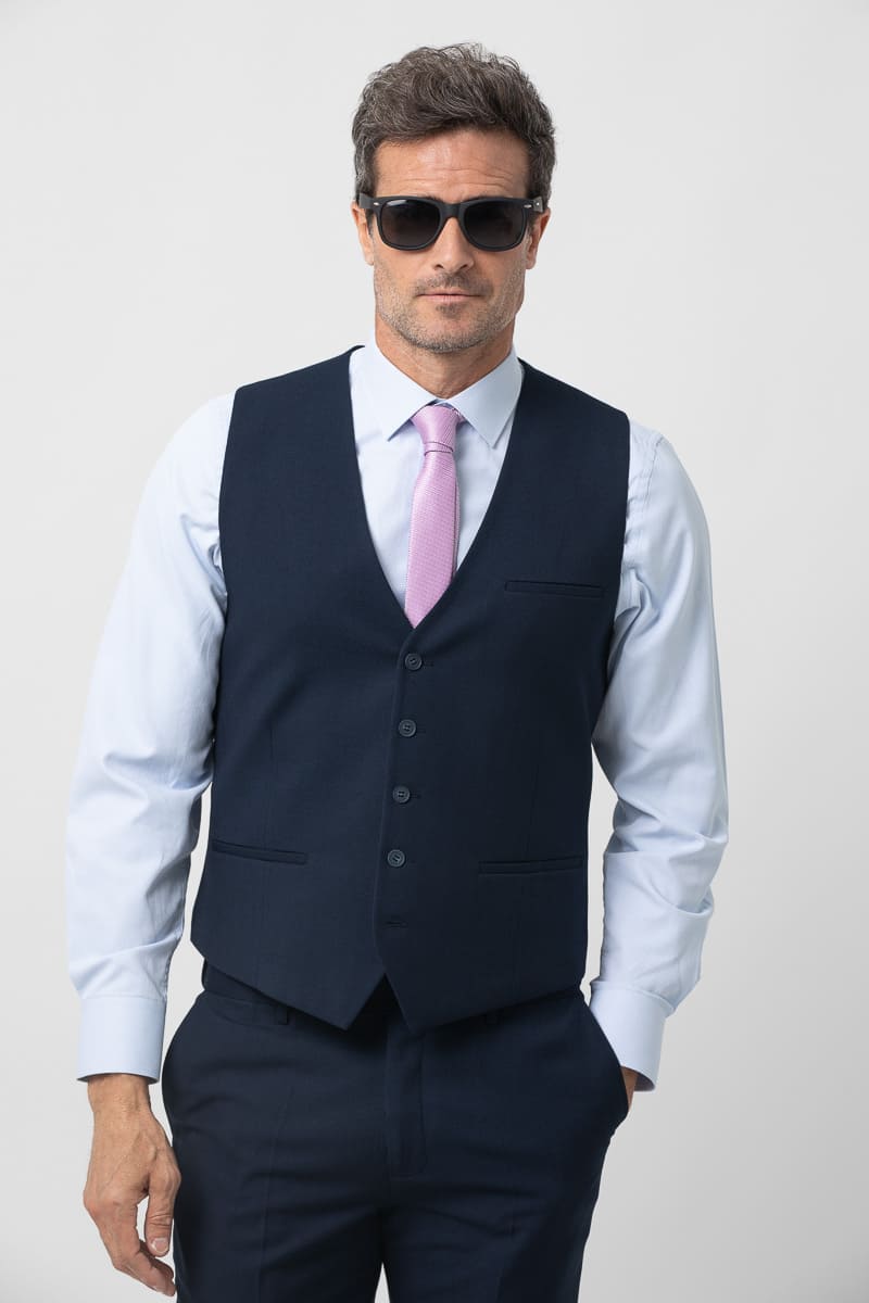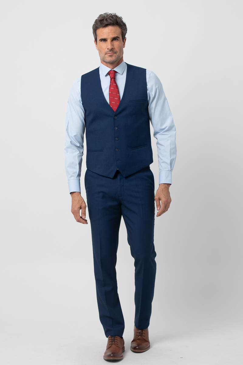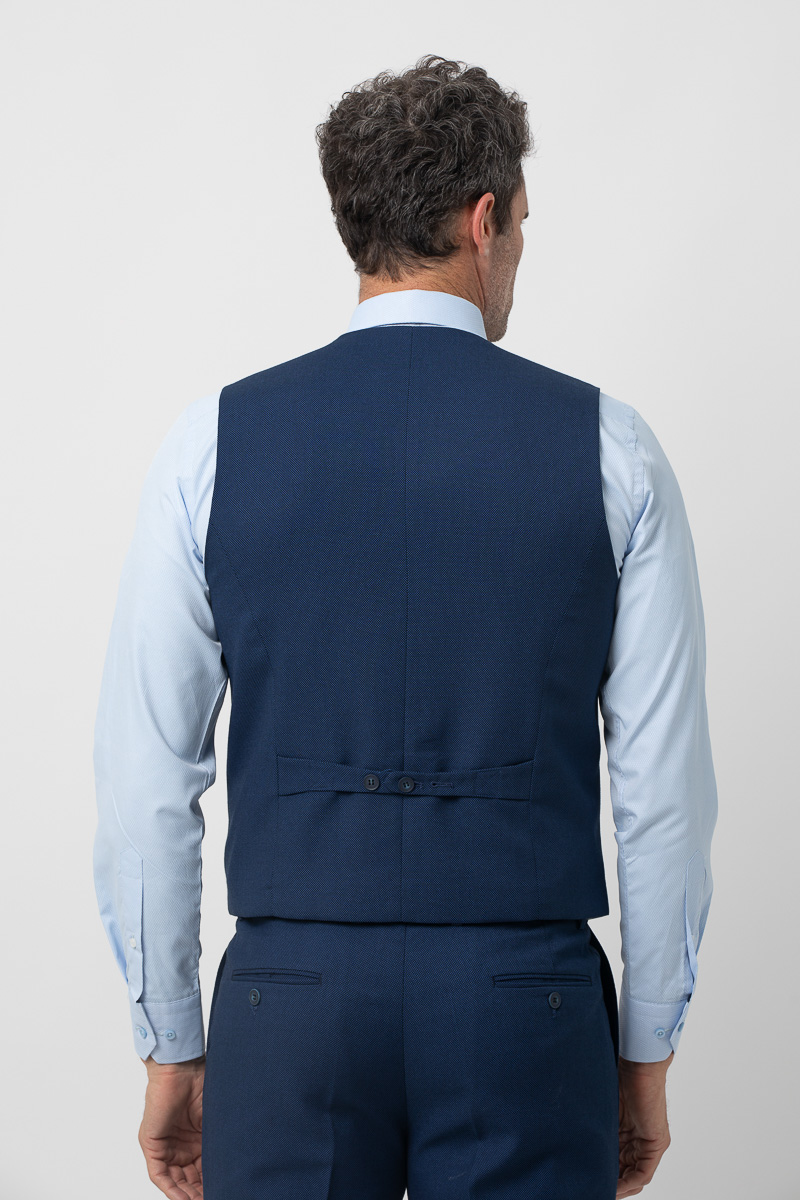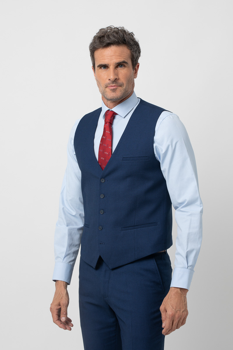Chaleco de traje en tejido elástico. Presenta cuello pico, cierre mediante botonadura frontal, dos bolsillos de vivo, banda ajustable por botones en la parte posterior y forro interior de fantasía. También está disponible la americana y el pantalón que completará el traje de tres piezas.