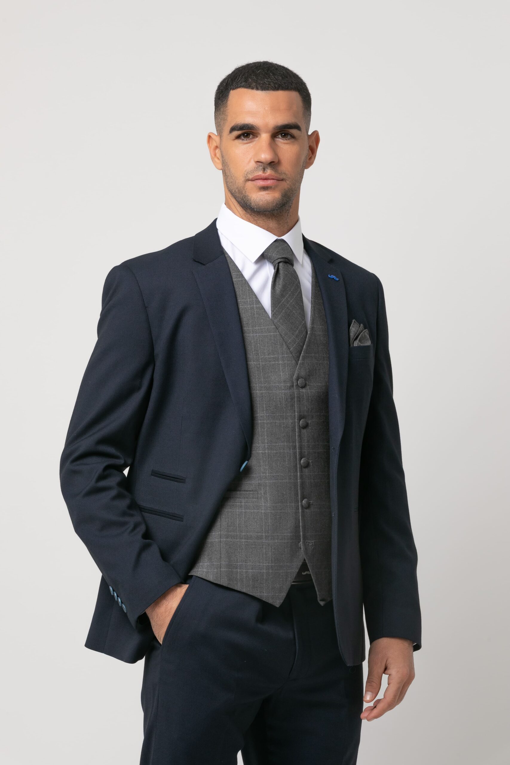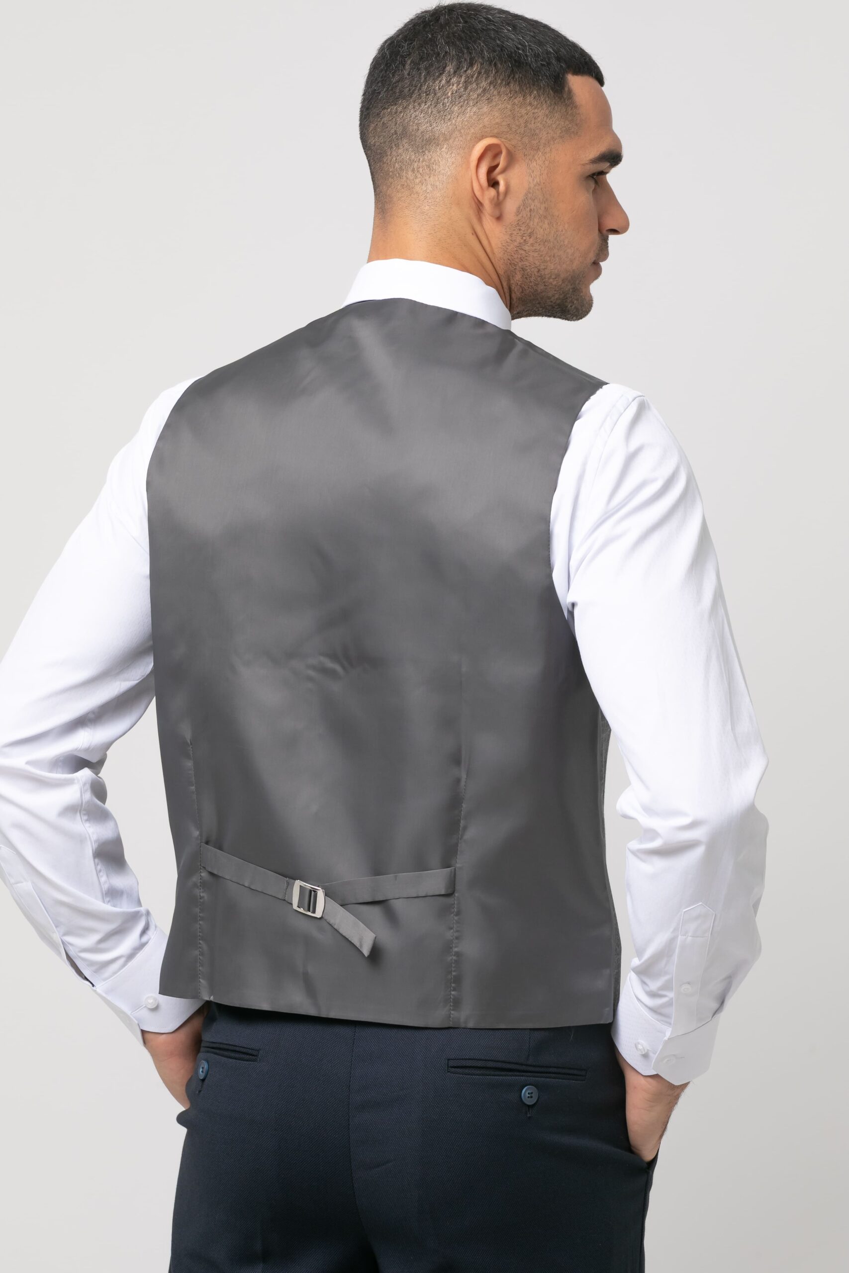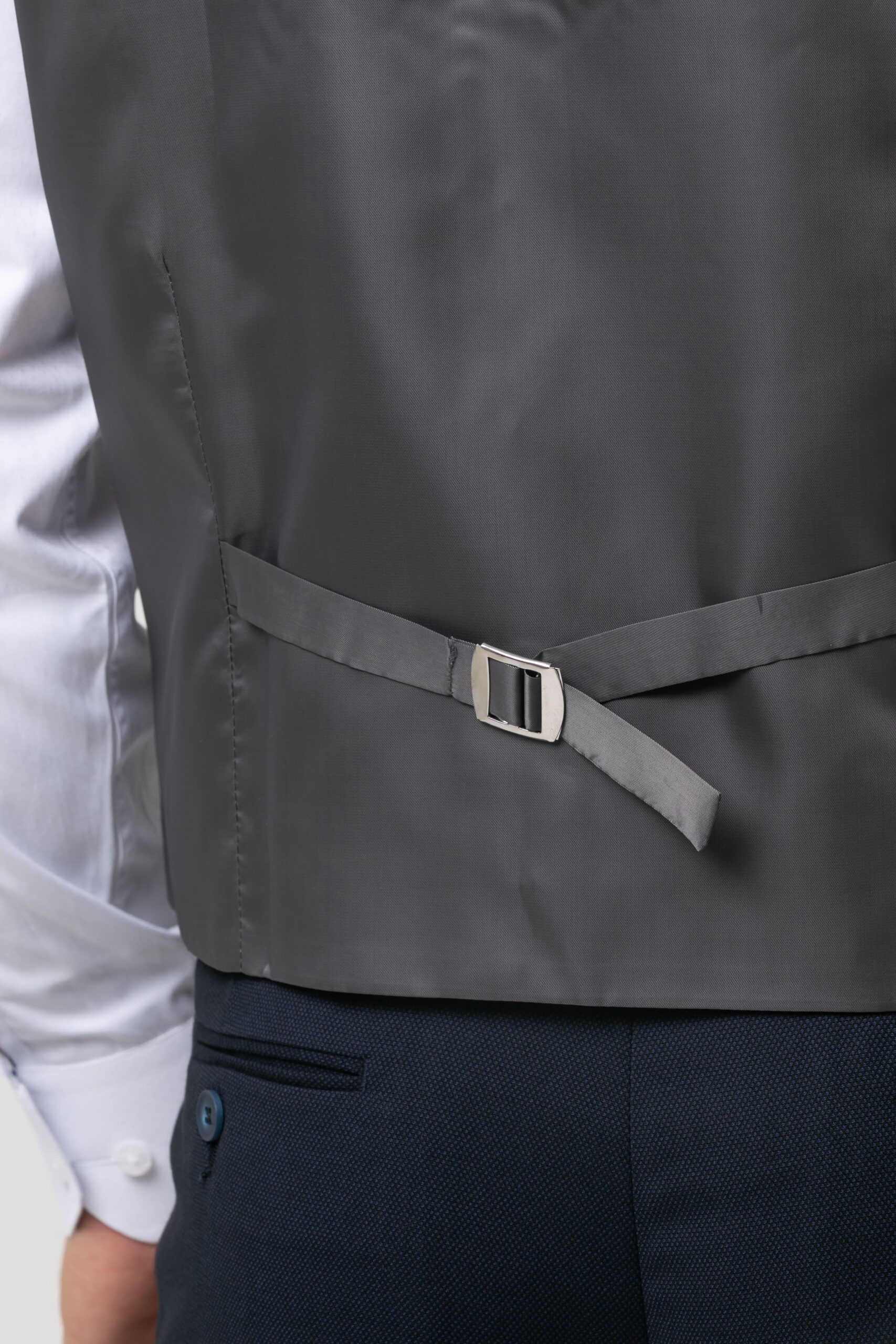 Chaleco de traje. Presenta cuello pico, cierre mediante botonadura frontal, dos bolsillos de vivo, banda ajustable por botones en la parte posterior y forro interior. Estuche con corbata y pañuelo a juego.