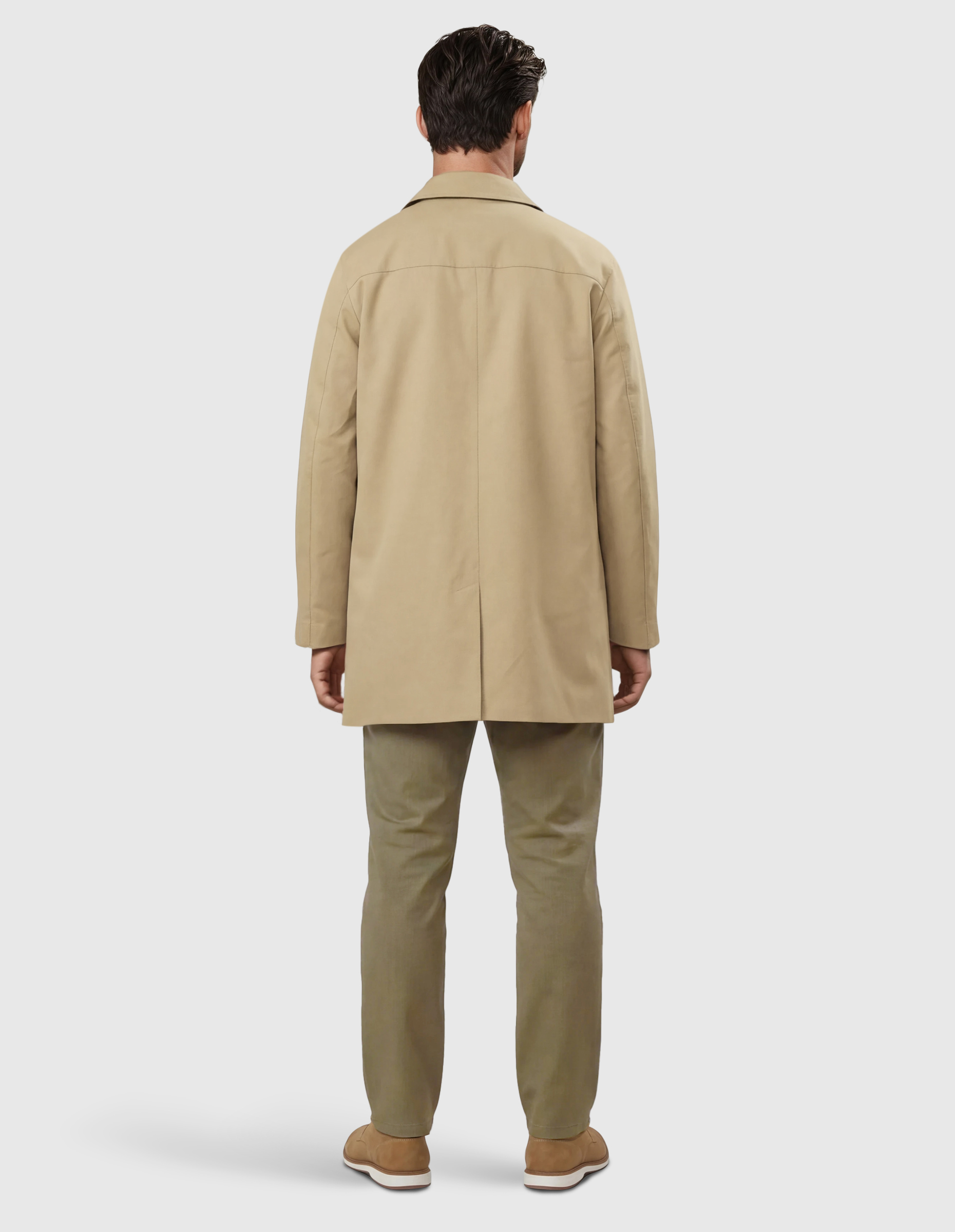 Abrigo de estructura, largo 3/4 con cuello camiseta y pecherín en nylon de cierre con cremallera y manga larga. Dos bolsillos laterales y forro con bolsillo interior. Abertura trasera y cierre frontal mediante botonadura oculta por una tapeta.