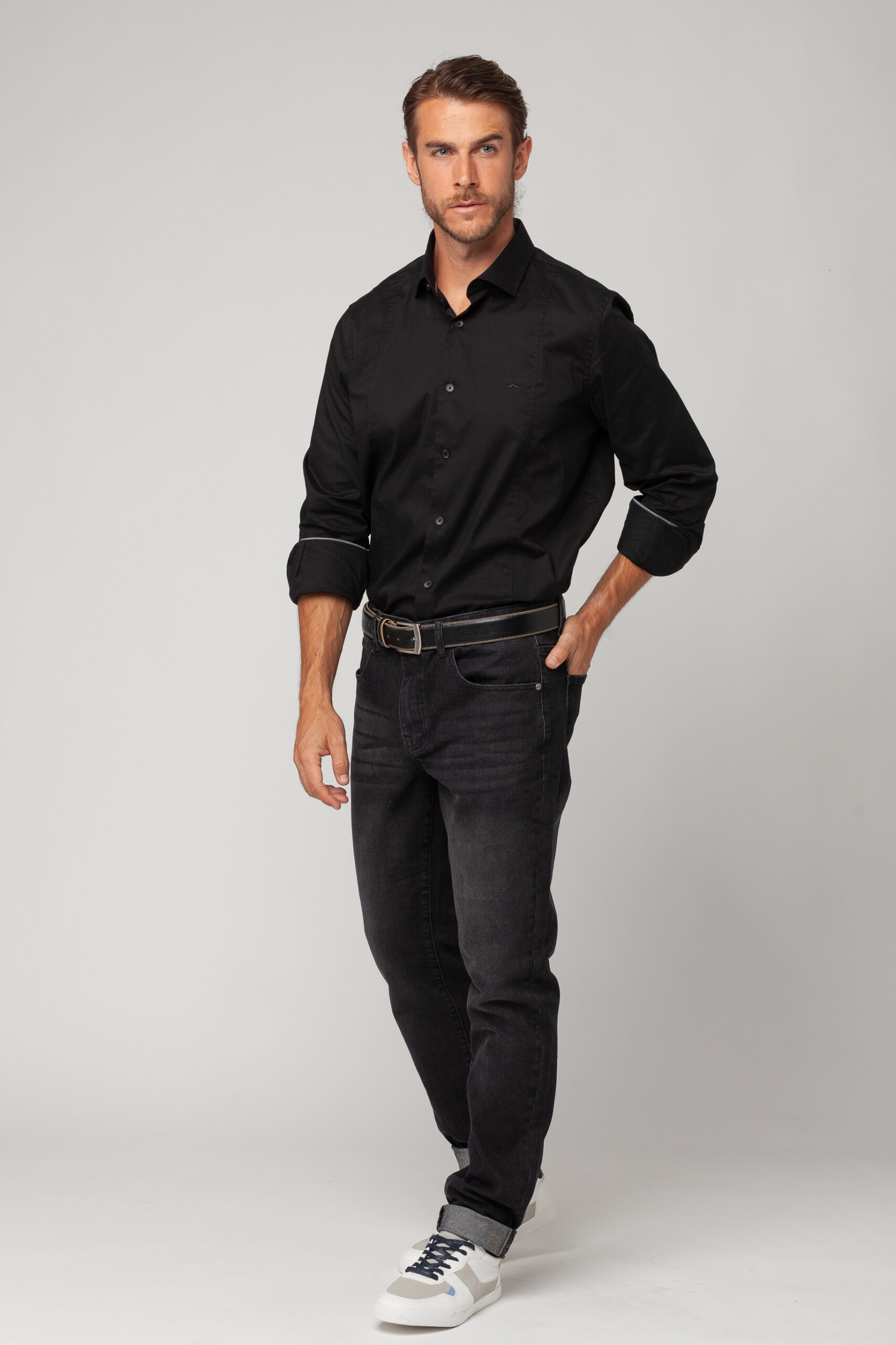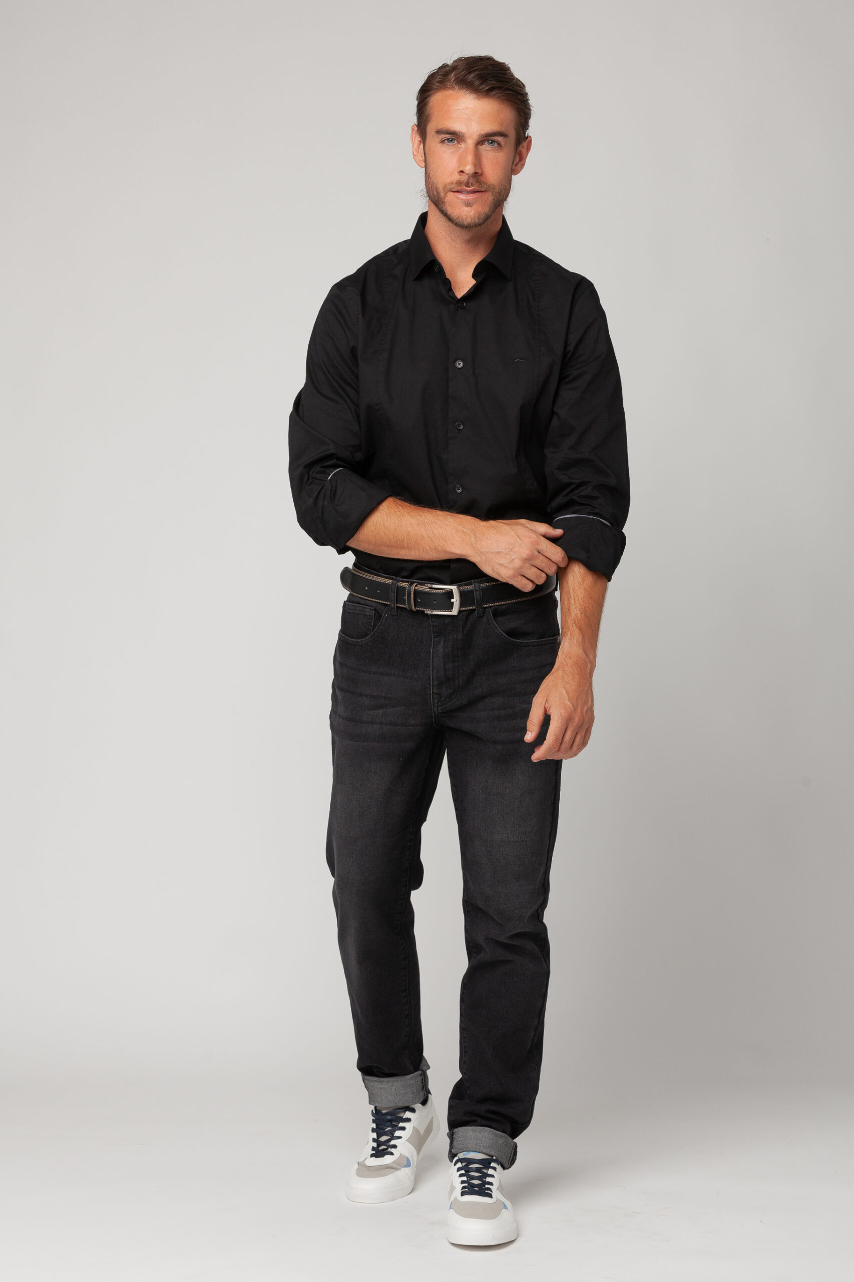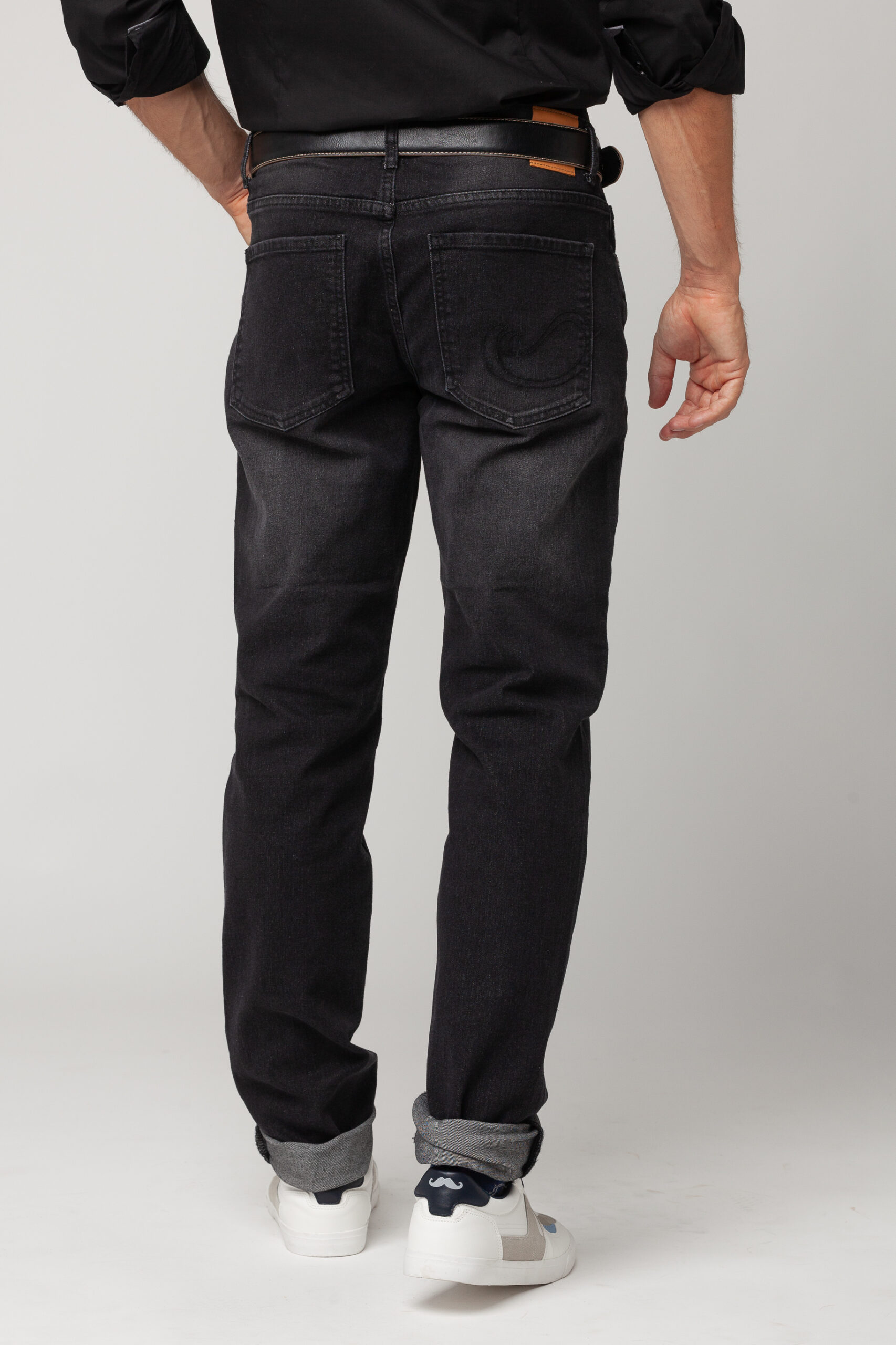 Vaquero confeccionado en tejido de algodón y elastano de gran confort. Presenta corte Slim Fit, cierre mediante cremallera y botón. Cuenta con cinco bolsillos, trabillas para el cinturón y etiqueta de polipiel en la parte posterior.