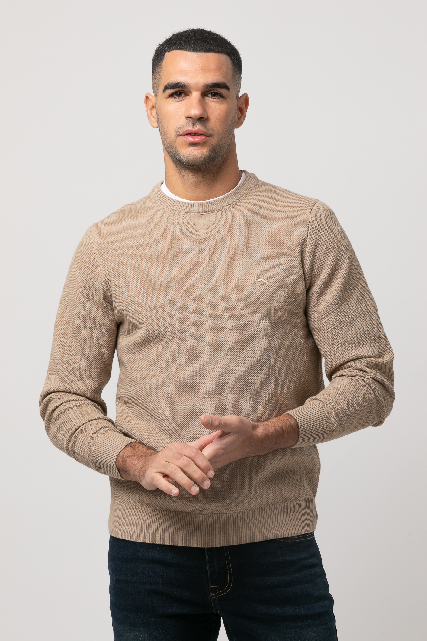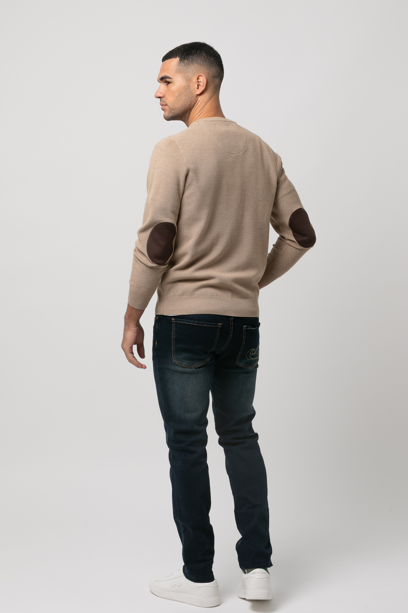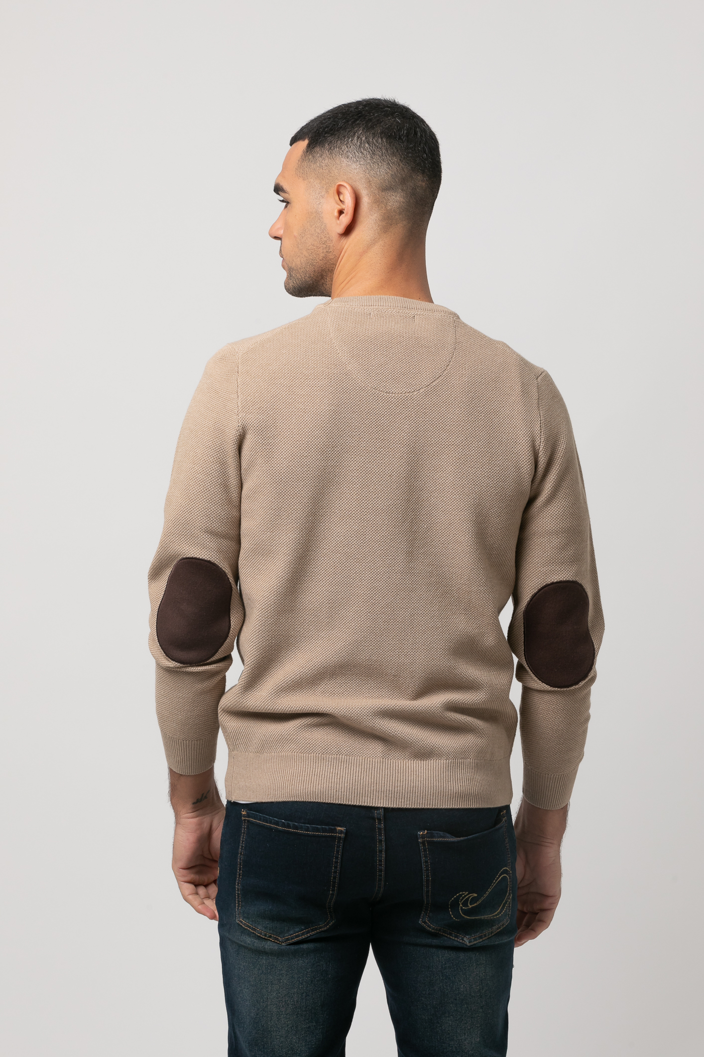 Jersey de punto, manga larga con coderas en contraste, cuello redondo y bajos terminados en rib. Logo de la marca marga bordado en el pecho al tono. Acabado BCI