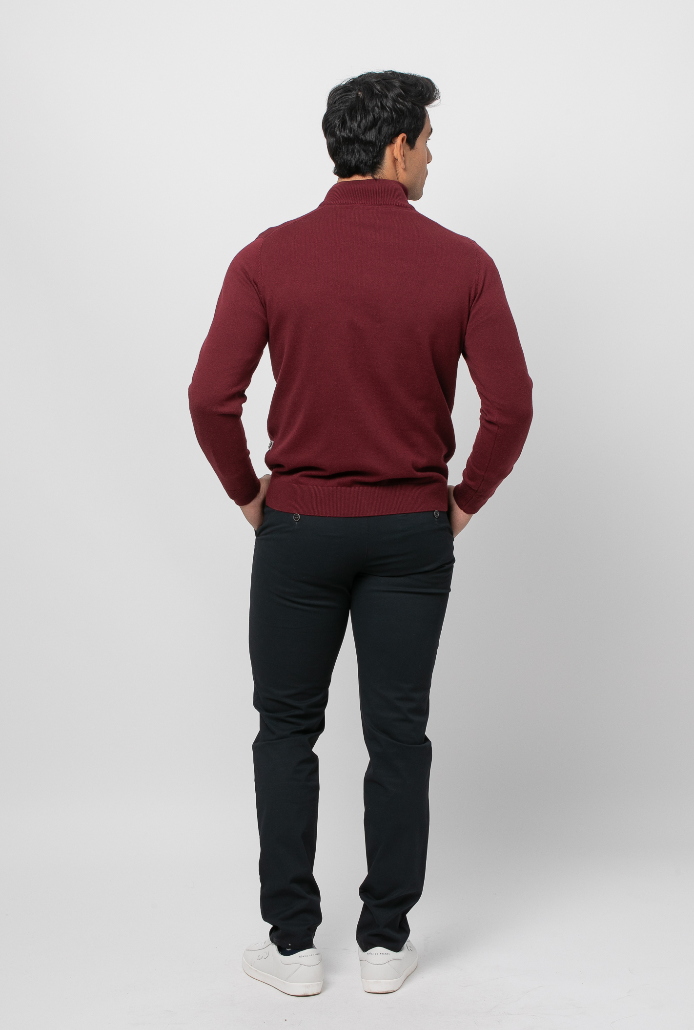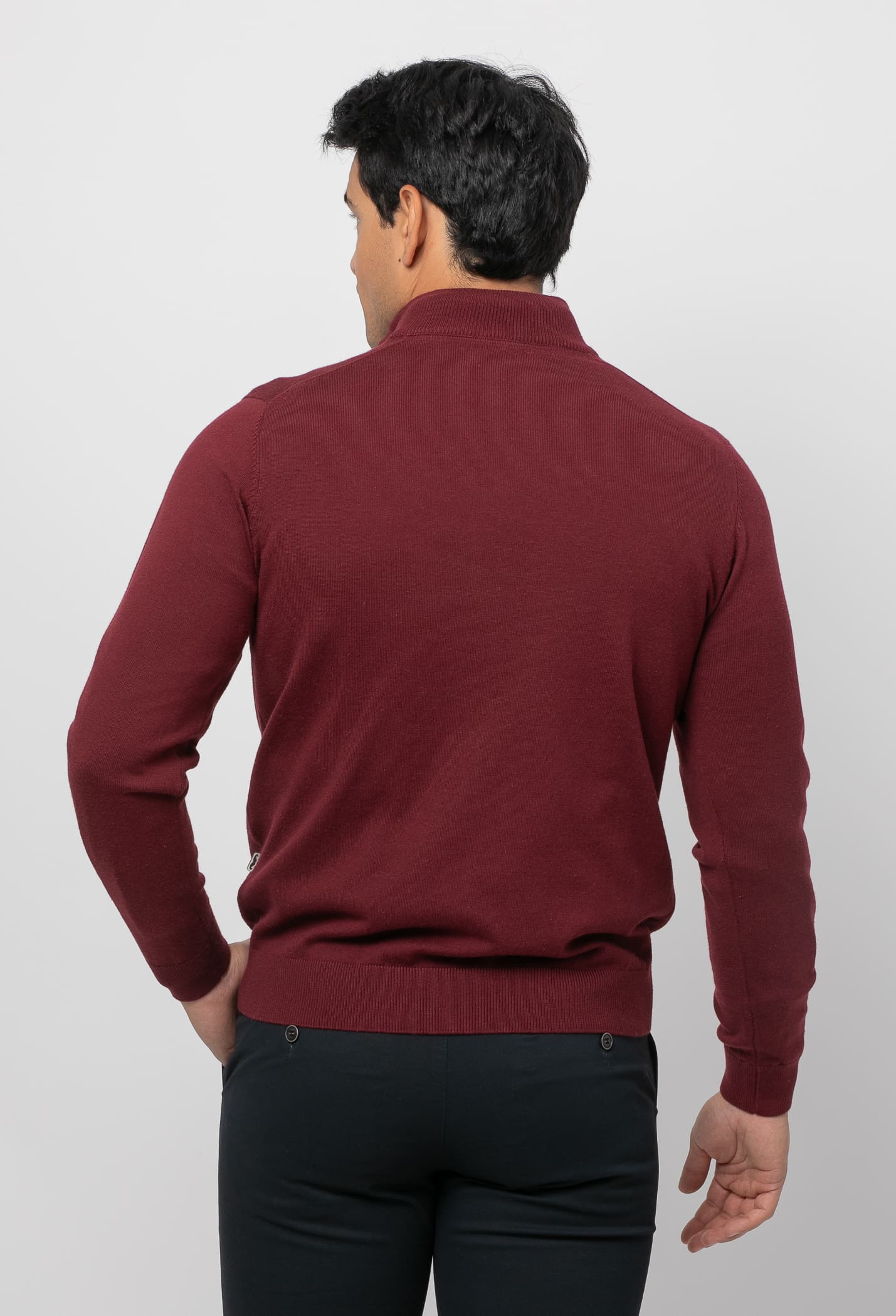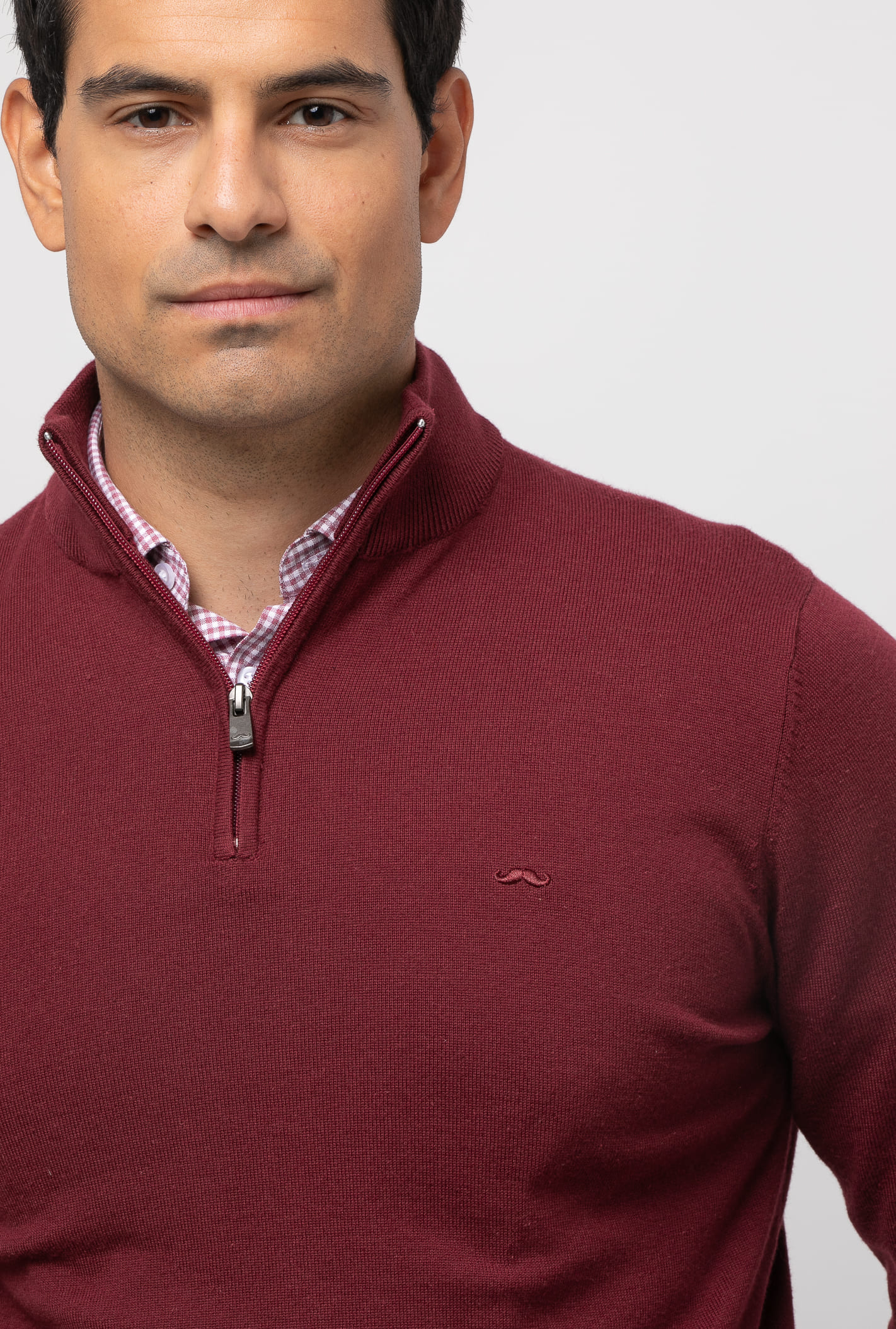 Jersey liso con cuello subido por cremallera. Corte recto. Manga larga y acabados acanalados. Bordado de nuestro bigote situado en el pecho al tono.