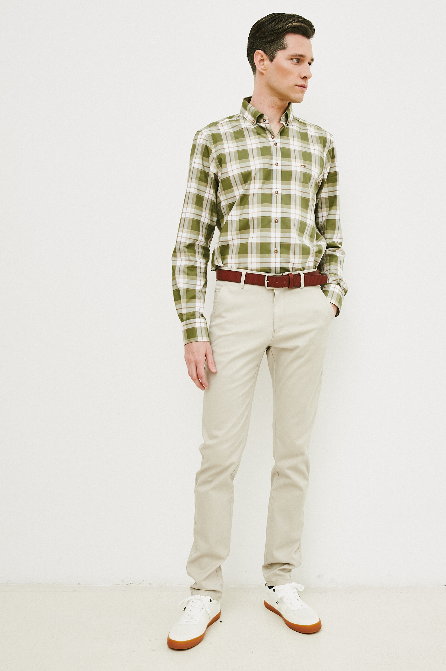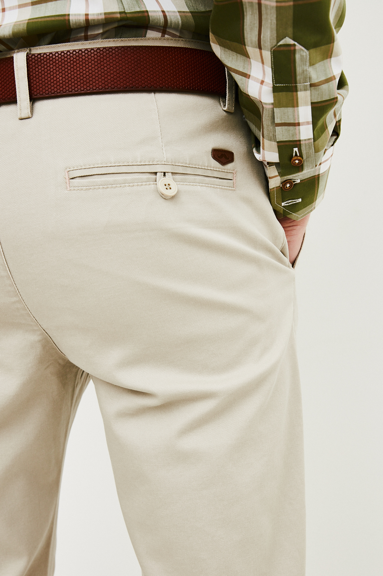 Pantalón de corte regular confeccionado en algodón y elastano de gran calidad y confort. Lleva un diseño de cuatro bolsillos, dos laterales y otros dos de vivo en la parte posterior. El cierre del pantalón es mediante cremallera y botón.