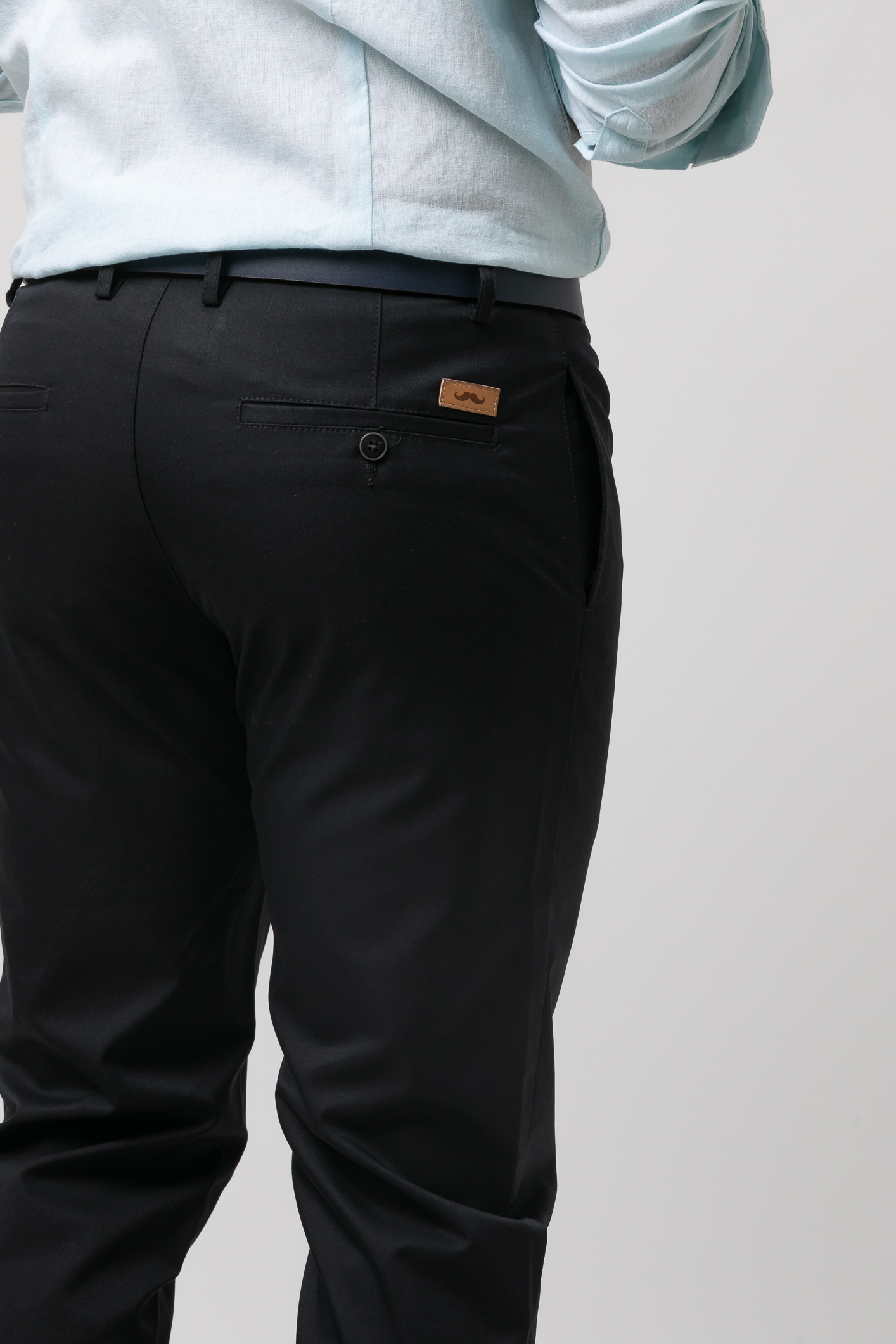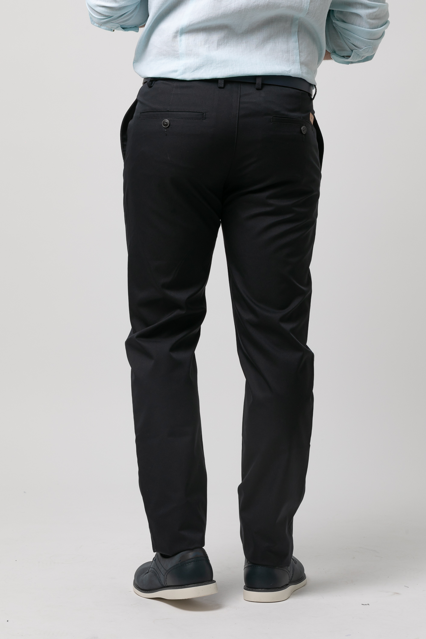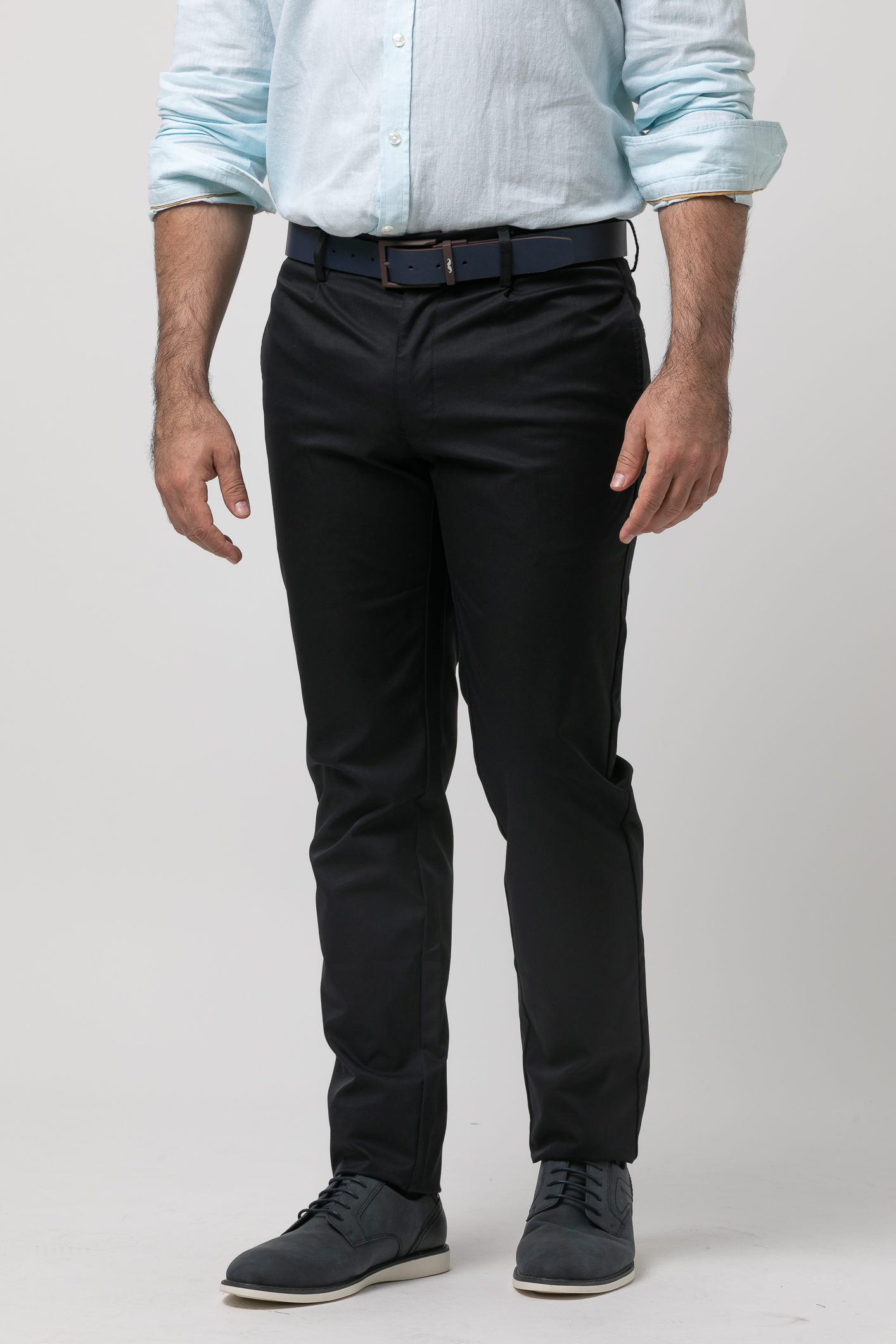 Pantalón casual con pinzas y algodón, cierre de botón contrastado y cremallera oculta, dos bolsillos laterales, dos traseros con solapa y trabillas para cinturón