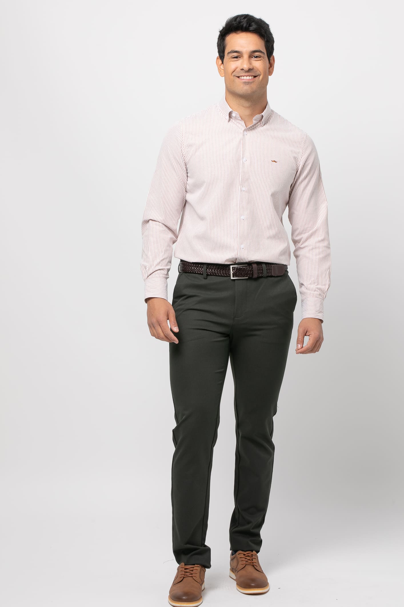 Pantalón de corte slim fit, cuenta con trabillas para el cinturón. El cierre es mediante cremallera y botón. Cuenta con cuatro bolsillos, dos laterales y dos de tapetas con botón en la parte posterior.