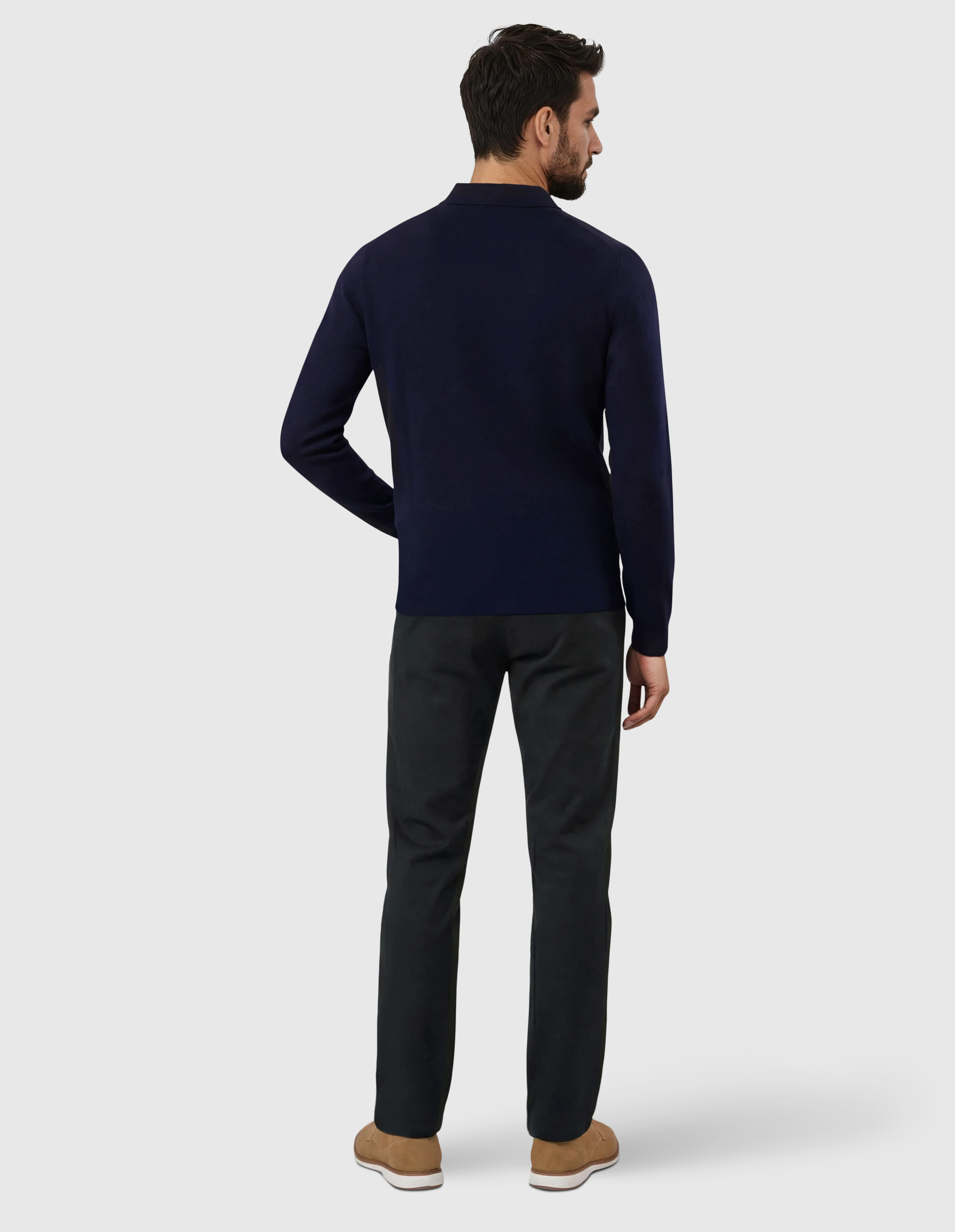Pantalón sport falso liso, tejido mezcla de gran calidad y confort, cierre de botón y cremallera oculta, dos bolsillos laterales, dos traseros con vivo y botón. Trabillas para cinturón.