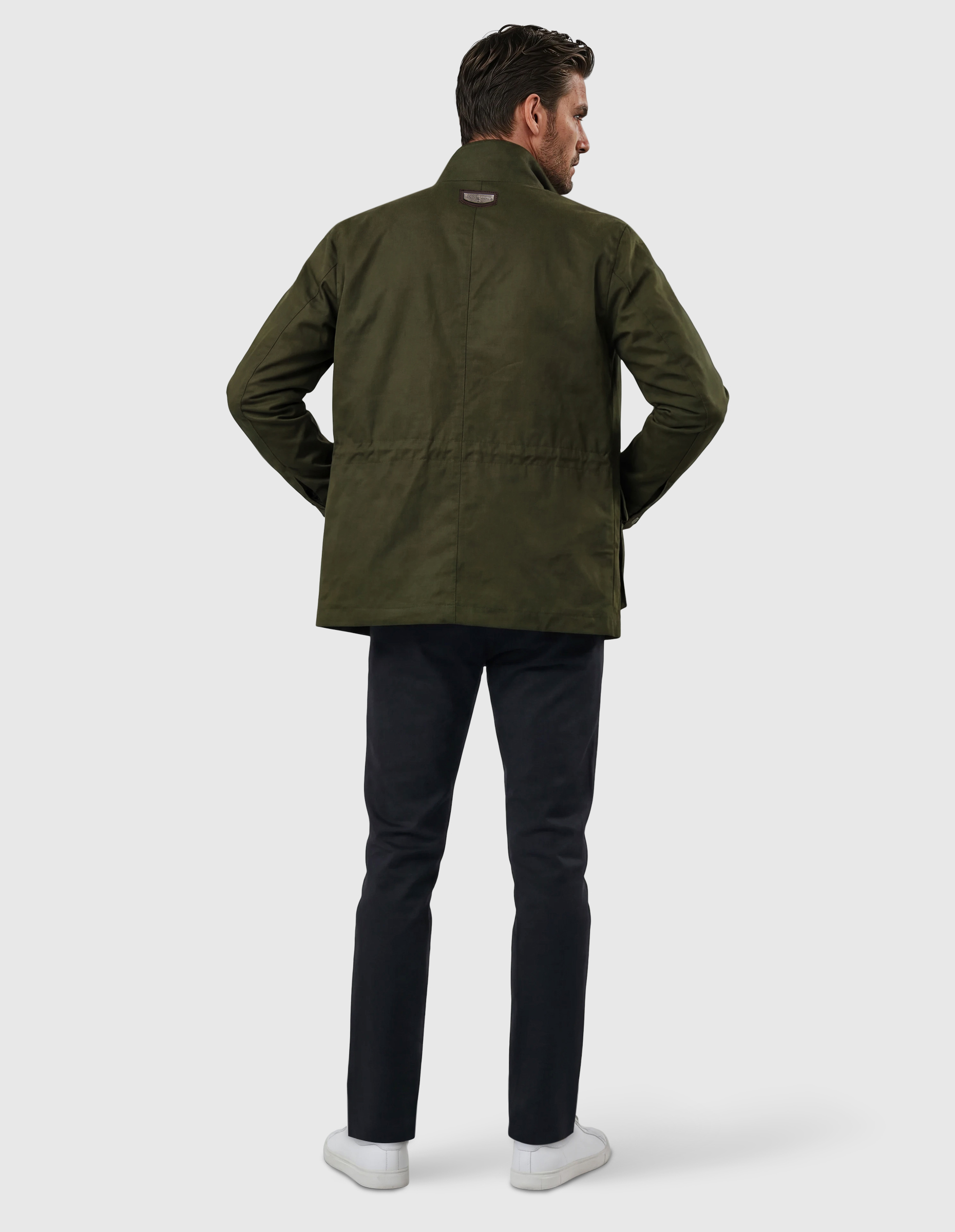 Cazadora antelina cuello alto, cierre frontal con cremallera y automáticos. Dos bolsillos dobles delanteros con tapeta y dos a la altura del pecho. Ajuste a la cintura interior con cordón ajustable, interior acolchado. cierre mangas botones automáticos. Chapa con el nonbre de la marca en la parte superior trasera.