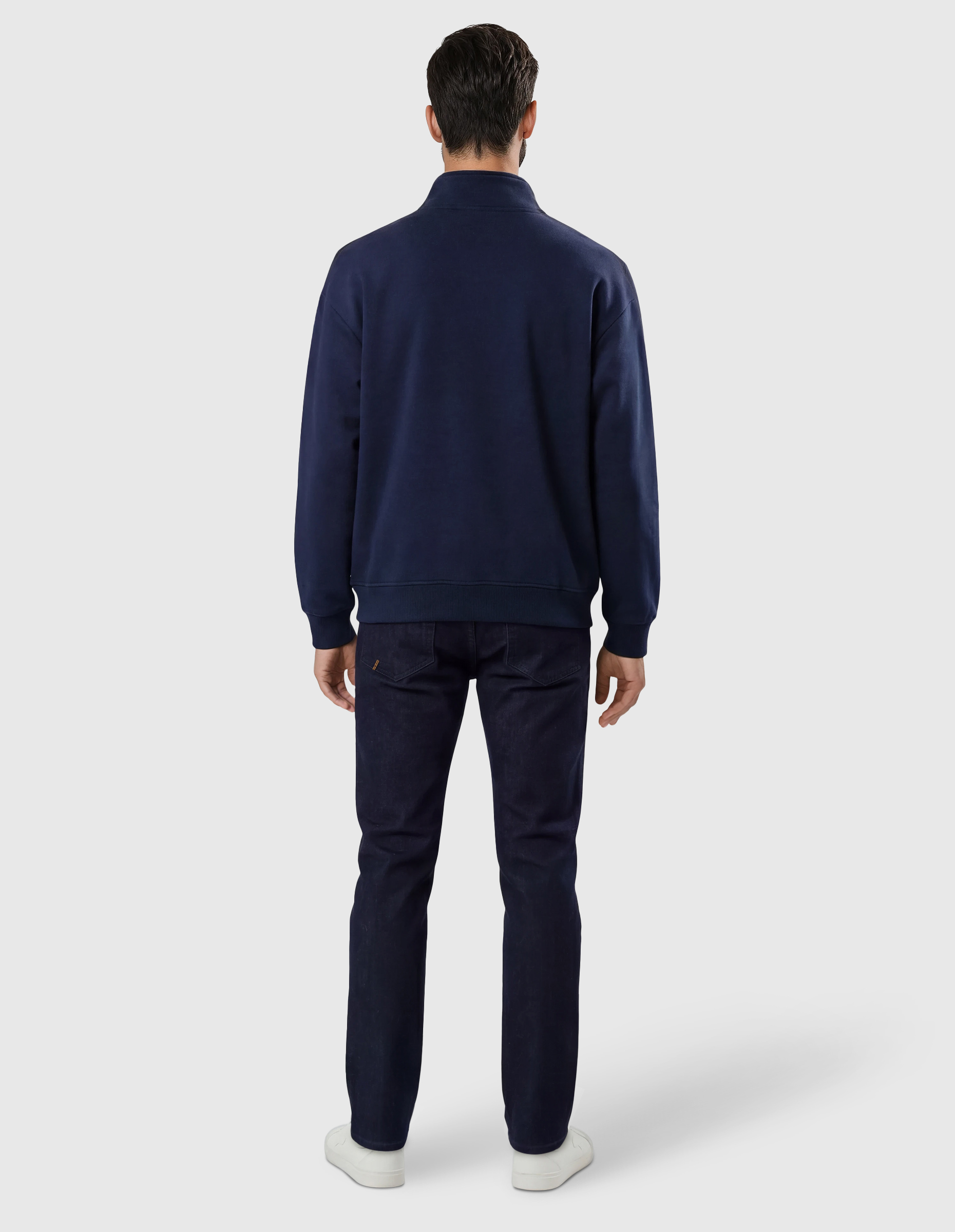 Sudadera cuello subido media cremallera, bolsillos laterales. Tejido soft, interior polar. Bigote serigrafiado a contraste en la parte central.