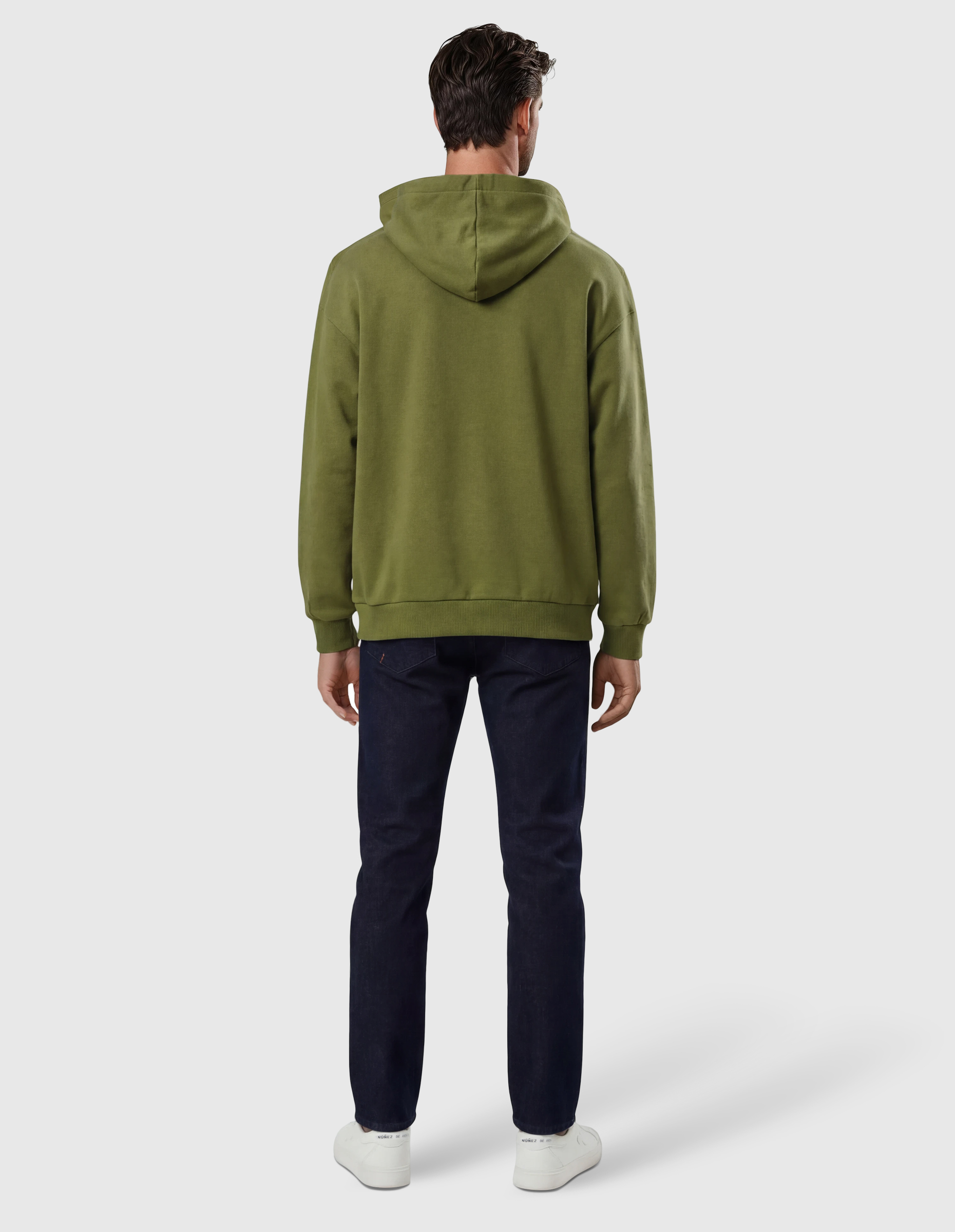 Sudadera capucha con cordón ajustable. Tejido soft interior polar. Bolsillo canguro. Detalle «parche» de tejido sin rematar con bigote engomado a la altura del pecho. Acabado rib.